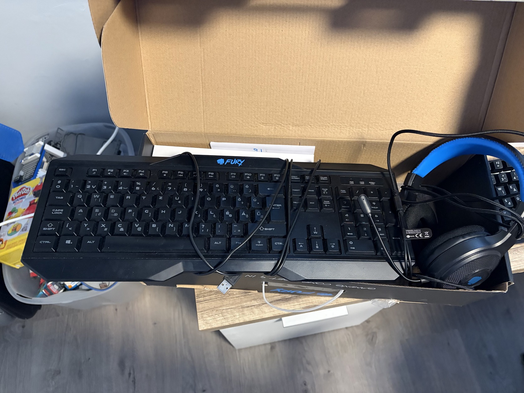 Csak a billentyűzet és fejhallgató, utóbbi egyáltalán nem volt használva.