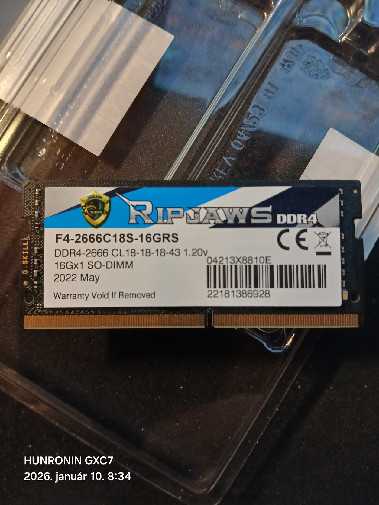 Eladó a címben szereplő G.Skill Ripjaws DDR4 SO-DIMM DDR4-2666 CL18-18-18 1.20V 16GB (1x16GB) laptop memória.