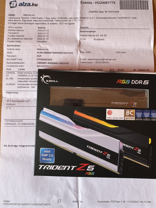 F5-7200J3445G16GX2-TZ5RK Alza gari még vagy 90 hónap , számlája doboza megvan , újszerű állapot !