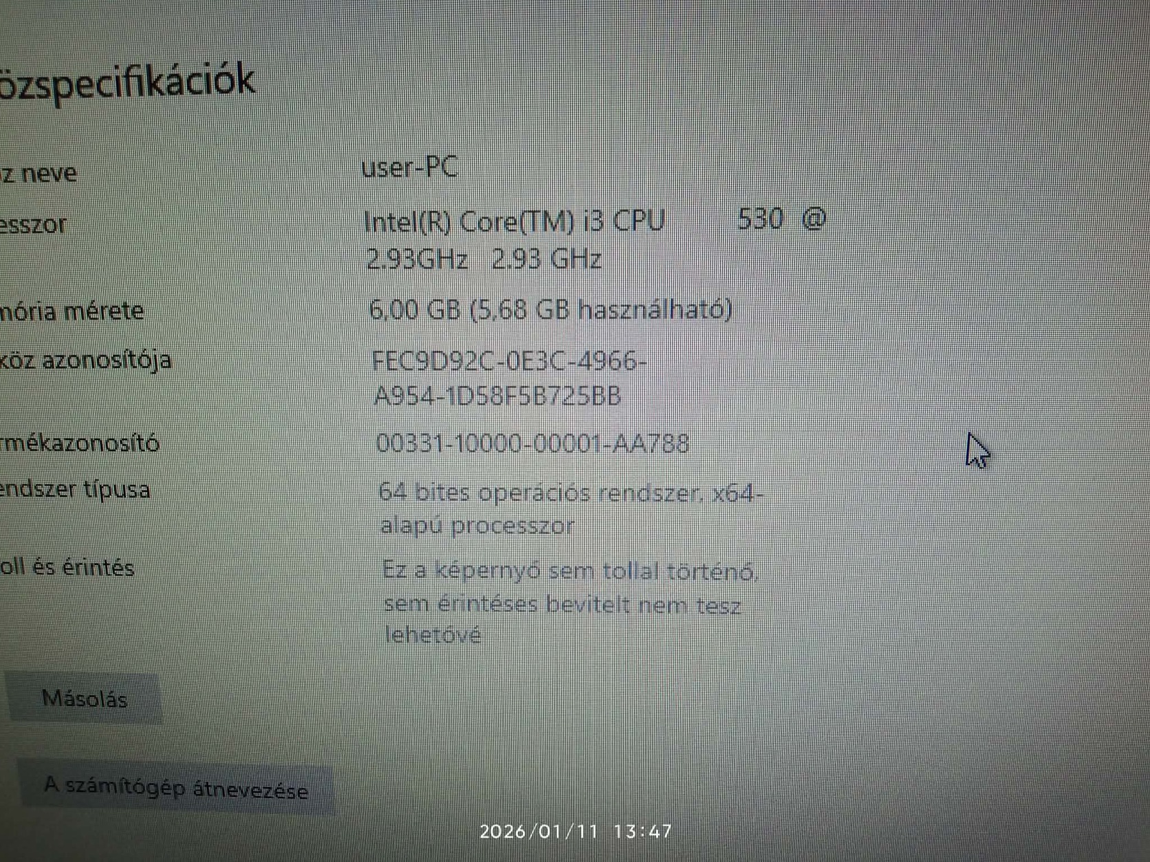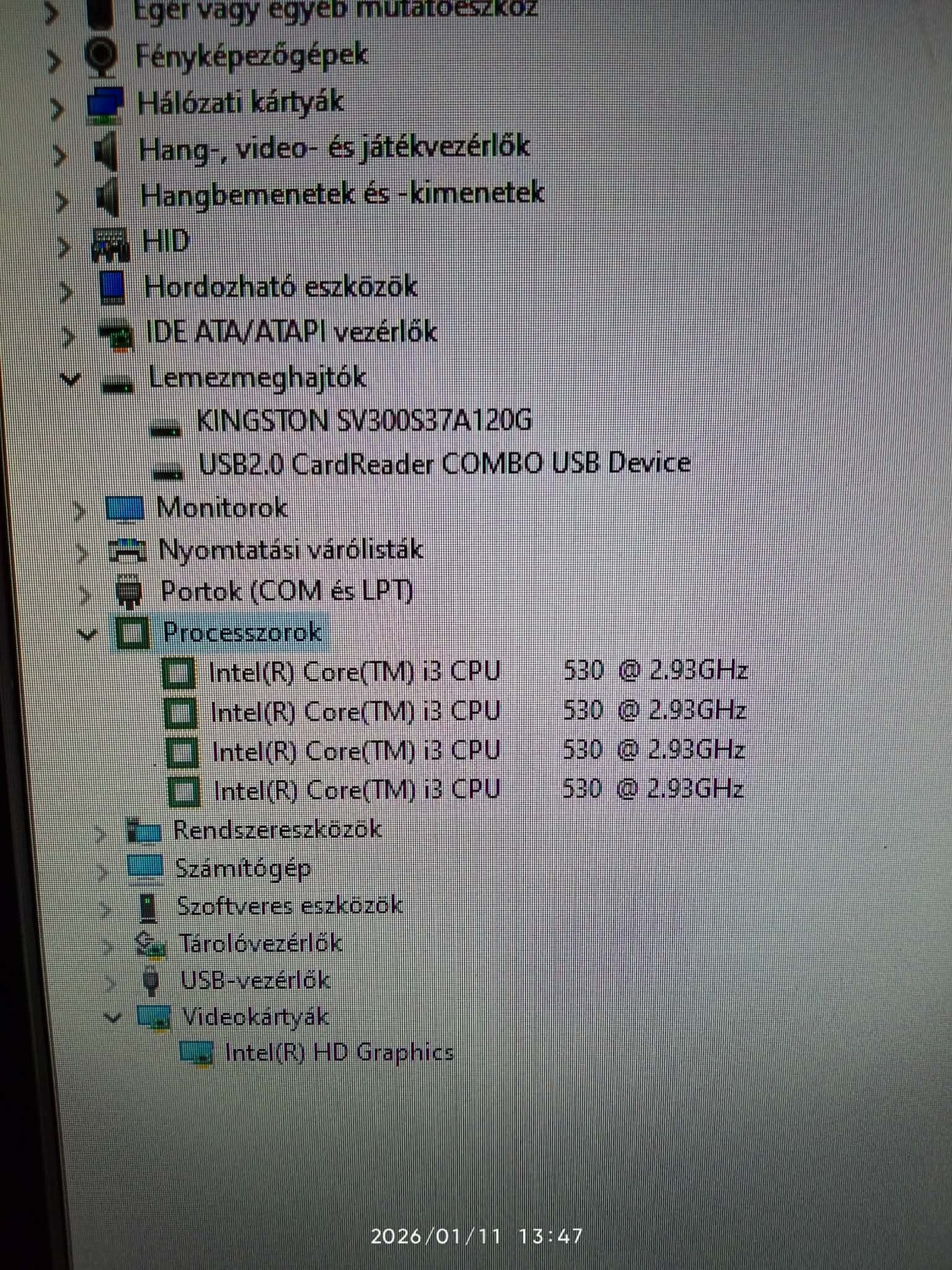 Processzor: Intel Core i3‑530 (kétmagos, ~2,93 GHz)