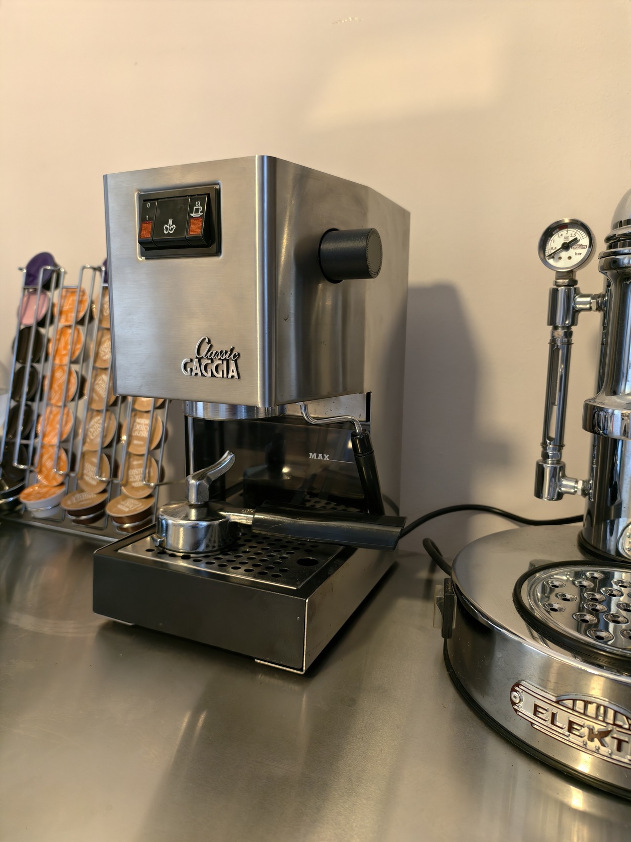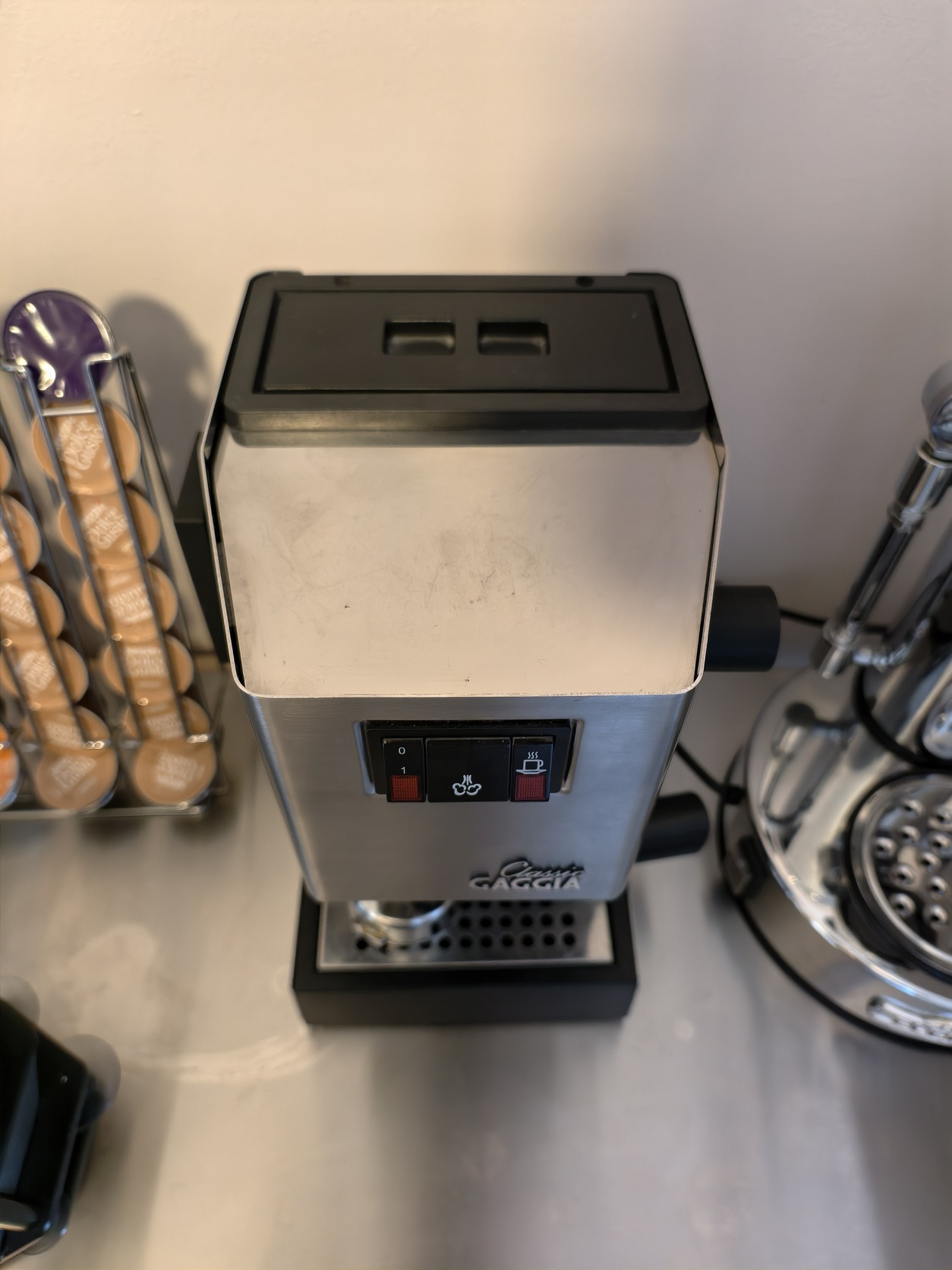 A gép egyébként egy teljesen alap Gaggia Classic, az alap karral és felsőszűrővel. Állapotát tekintve karcmentes, még a pohártartó is szép állapotú, a gép még az Olaszországban, Milánóban gyártottak közül való.