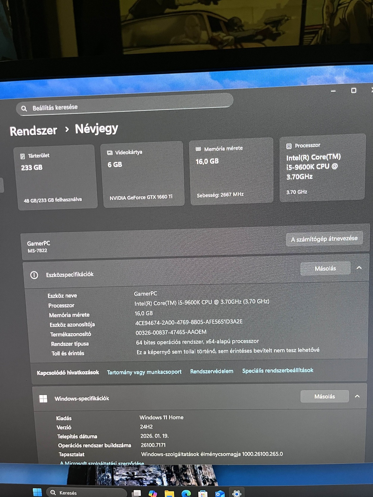 A gép frissen pasztázva és Win11 Home al telepitve aktiválva