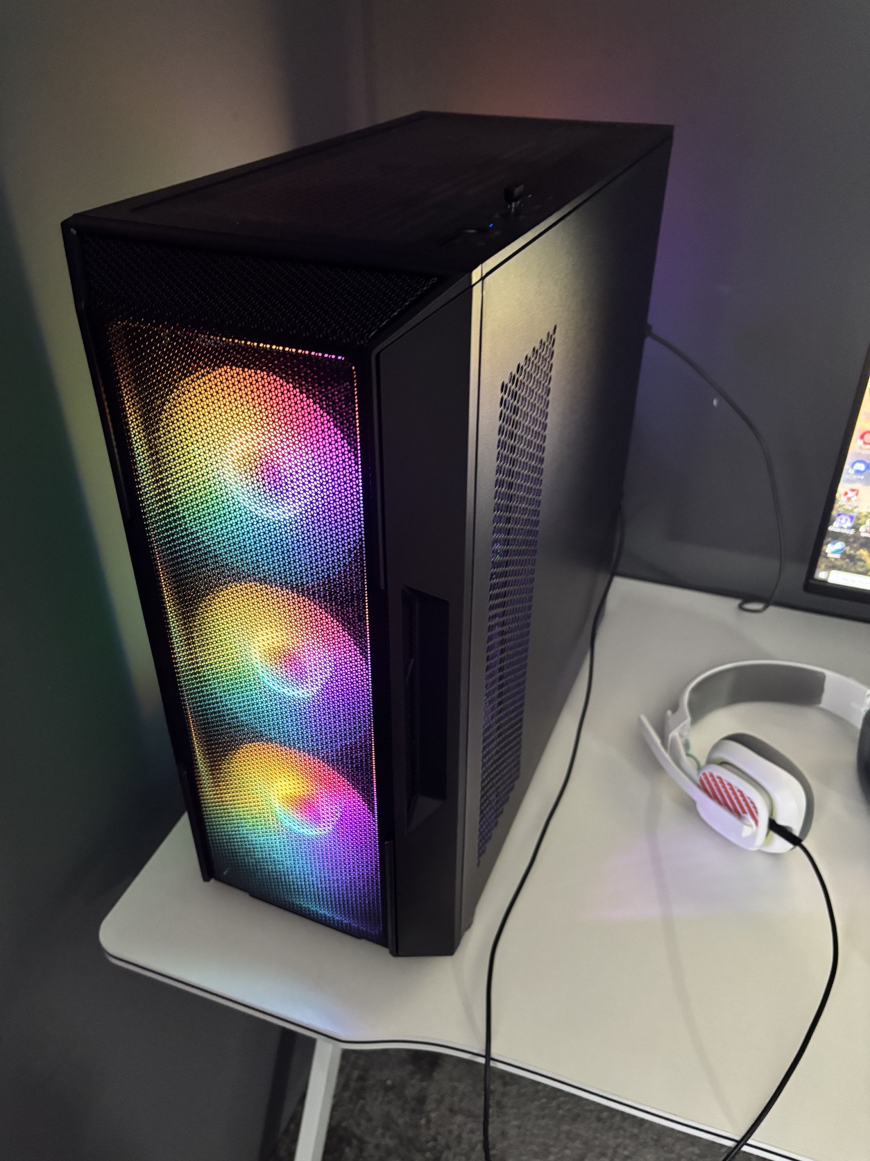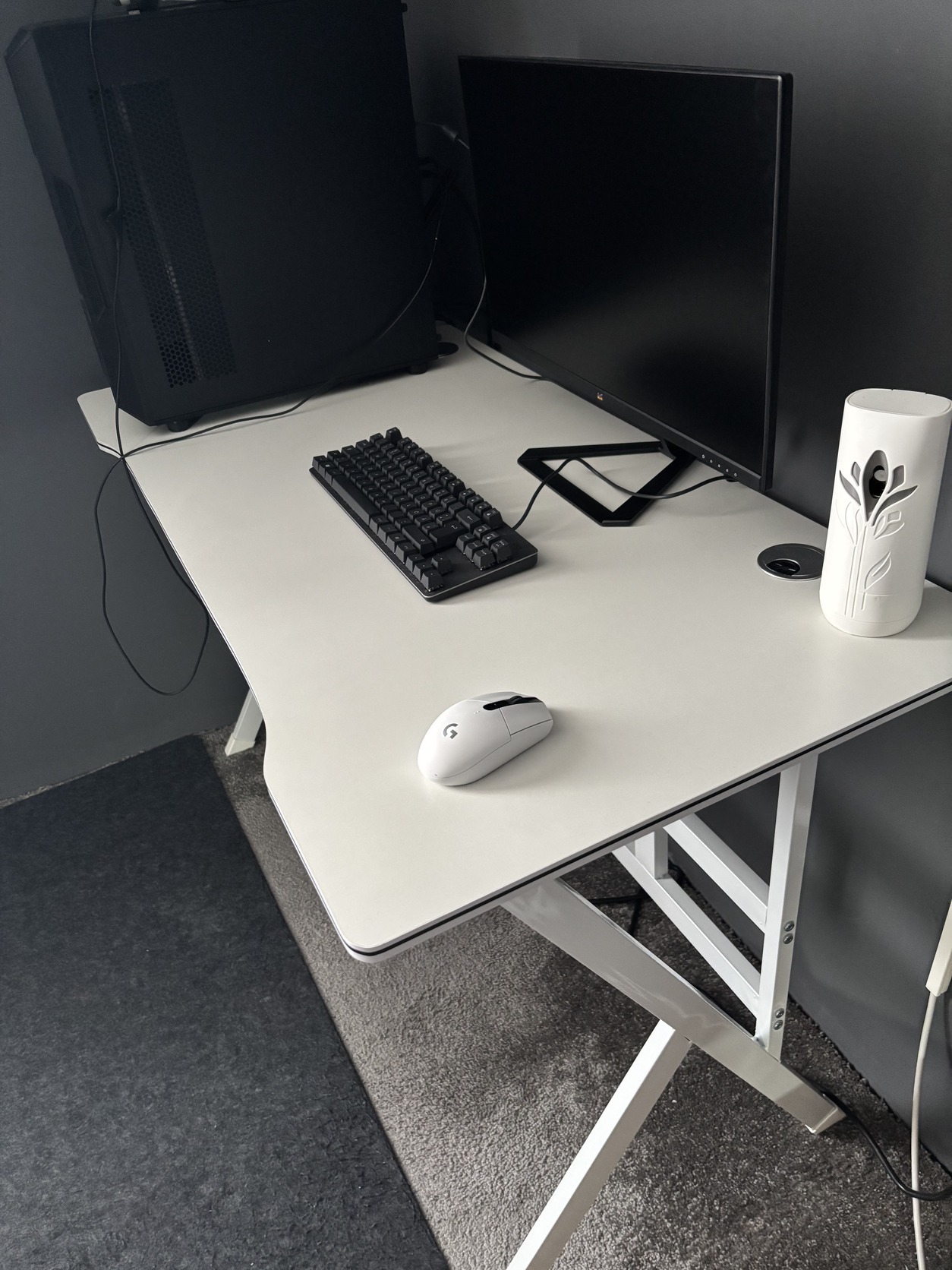 ami tartalmaz egy gamer asztalt, logitech fejhallgatót, logitech vezetéknélküli gamer egeret