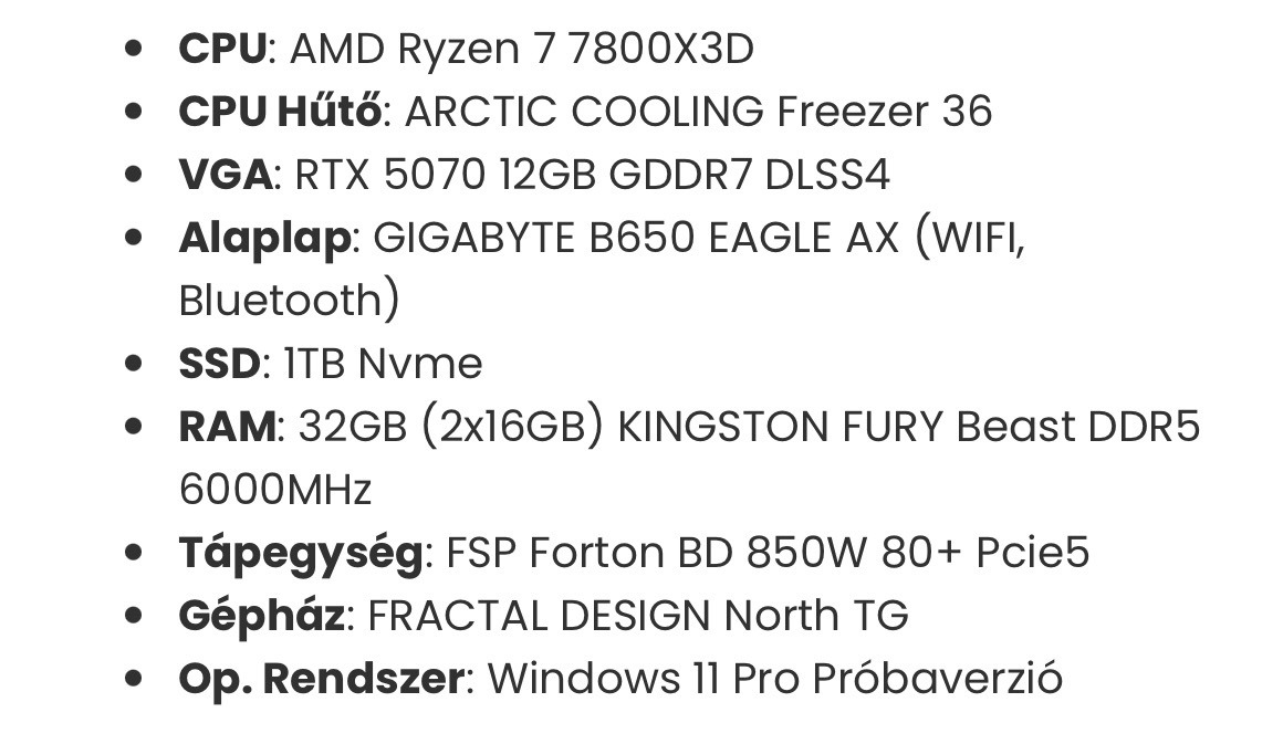 Eladásra kínálom megvigyázott számítógépem. 2025.11.16.-án vásároltam. Minden alkatrész doboza meg van. 3 év garancia él mindenre a vásárlás napjától. Minden játékot hiba nélkül futtatott, nem volt vele semmi féle probléma. Csak egyben eladó nem bontom és nem is cserélem! Ennek tudatában érdeklődj! A specifikációt a képekhez csatolom. Ha felkeltette az érdeklődésed, privátban szívesen válaszolok az esetleges kérdésekre!