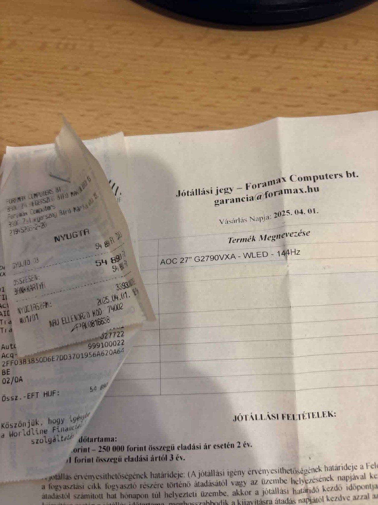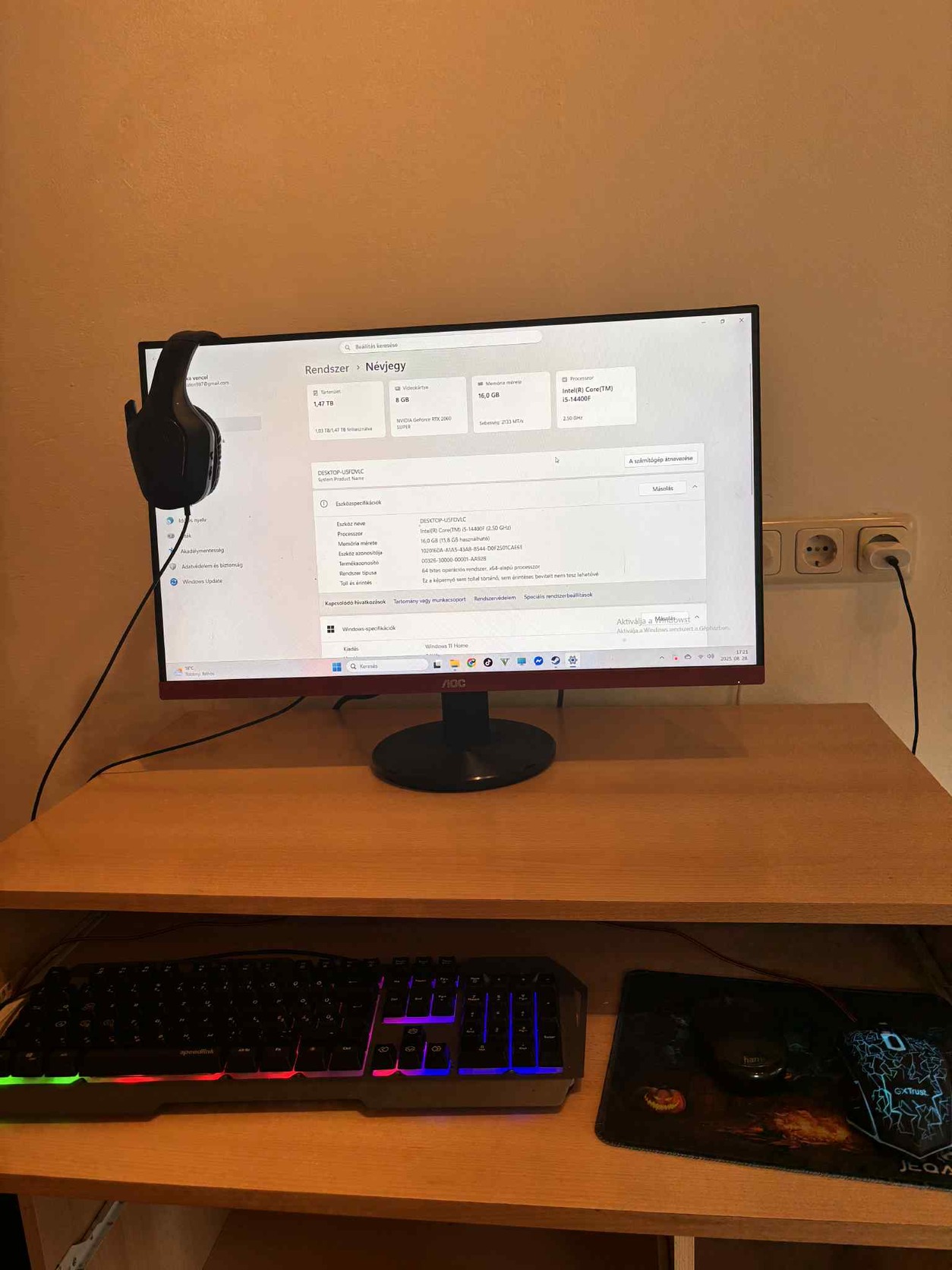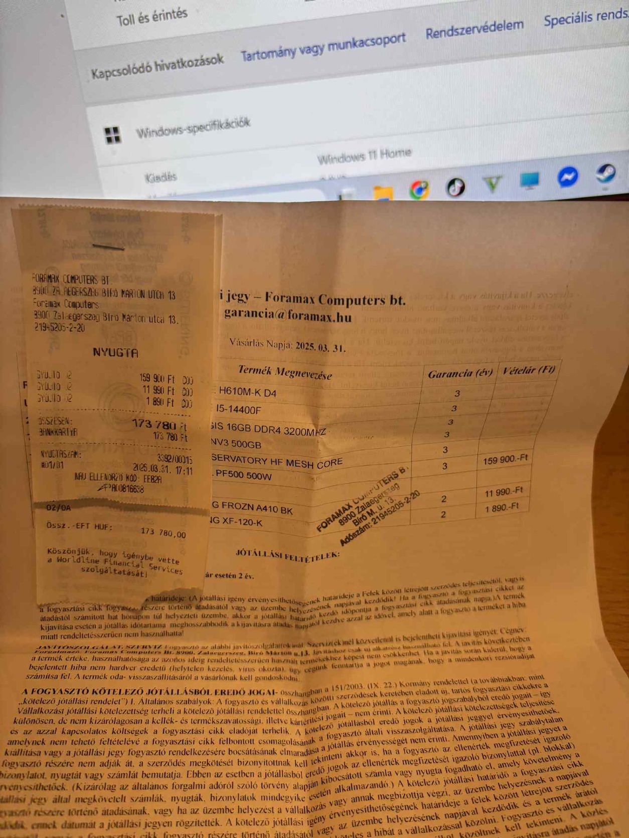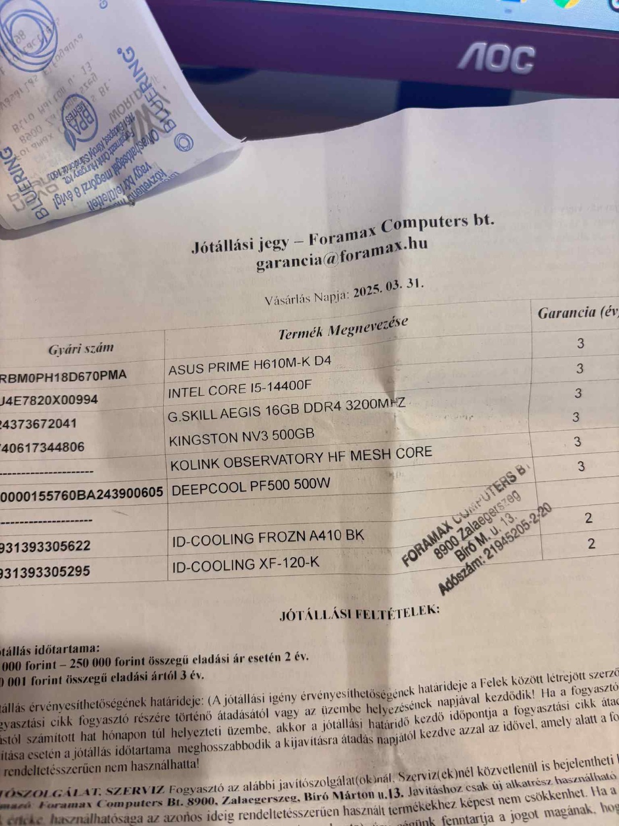 A PC 2025 marcius 31-én lett vásárolva amint a számlákon is látható tehát még majdnem 3 év garancia van rajta! Specifikáció: Gépház: Kolink observatory hf mesh core Alaplap: Asus prime H610m-K D4 RAM: 16gb G.Skill Aegis DDR4 3200MHz CPU: I5 14400f 10 mag 16szál 2.5GHz Turbo boost: 4.7GHz PSU: Deepcool 500w Háttértár: SSD Kingston m.2 500gb 125gb SSD Sata az oprendeszernek, 1tb HDD