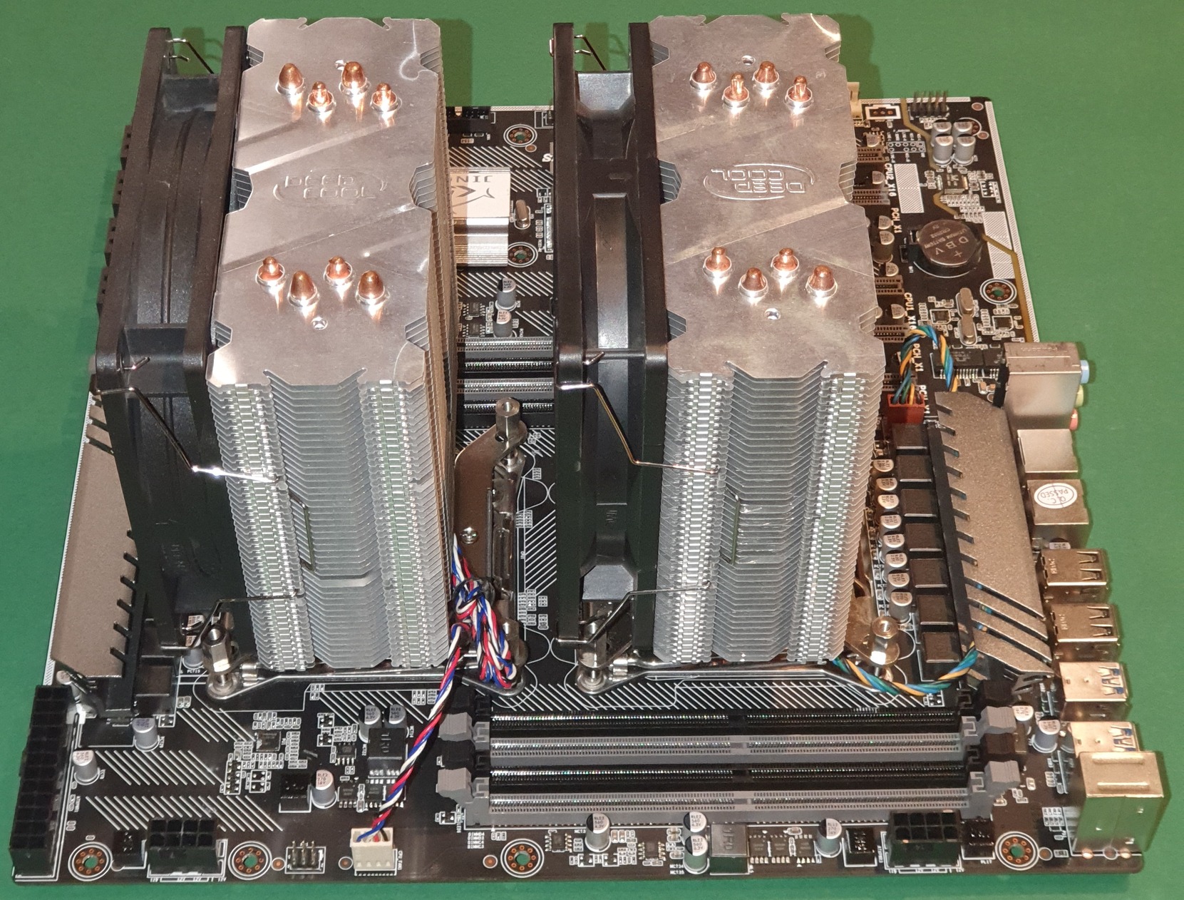 Hűtő: DeepCool Gammax 4 hőcsövesek, de a kerregő LED-es ventilátorok helyett nagyobb légszállítású, sokkal halkabb ipari Adda motorok kerültek fel.