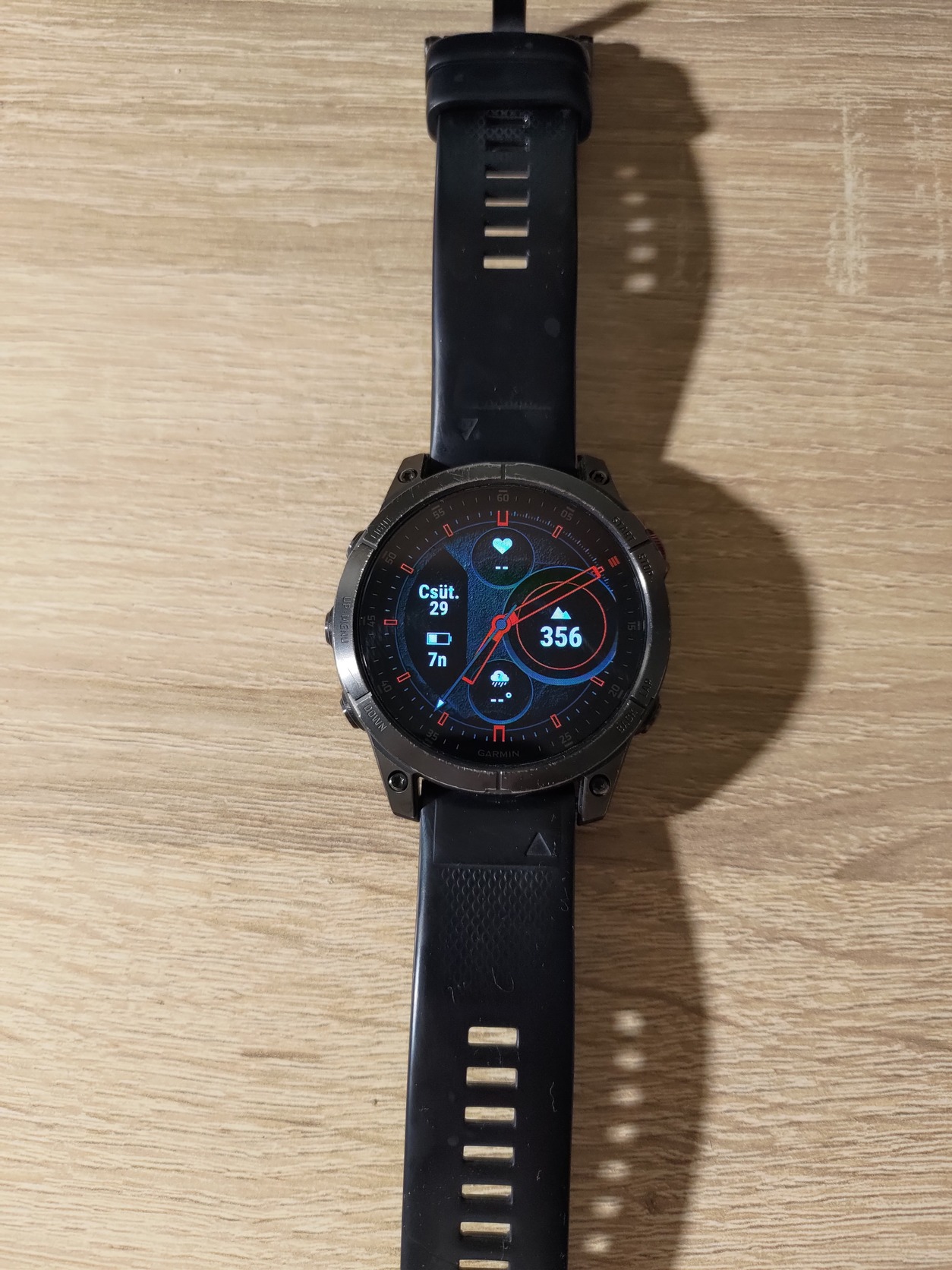 Garmin Epix Gen 2 Sapphire Titanium okosóra töltővel és egy extra szíjjal. Az akkumulátor egy töltéssel 17 napig bírja.