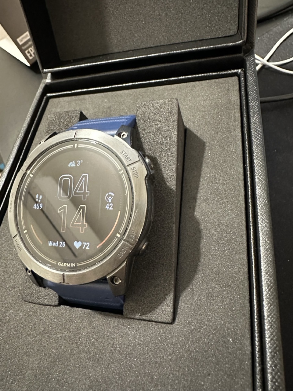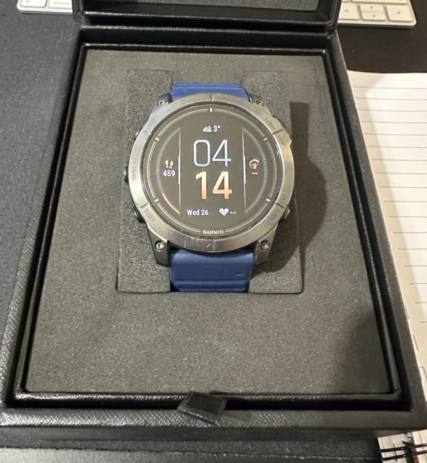 Premium kiadás, bőrszíjjal, de sajnos a bőr szíj állapota nem jó (attól függetlenül azt is adom hozzá kérésre arról is adok képet), ezért használtam a gyári kék Garmin szíjjal, van hozzá fekete szíj is amit természtesen adok hozzá!
