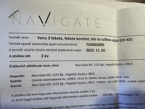 Magyarországon vásárolt 2025 November 02-ig garanciális Garmin Venu 3 .