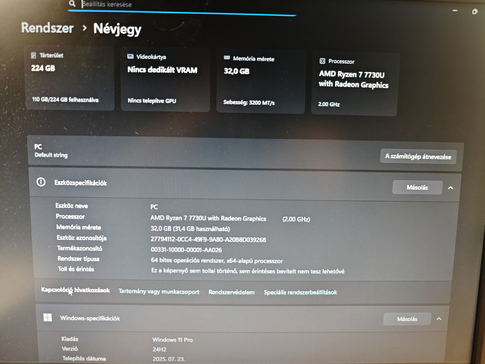 CPU: AMD Ryzen 7 7730U 8mag 16 szál | 4.5ghz turbo (Default TDP 15W)