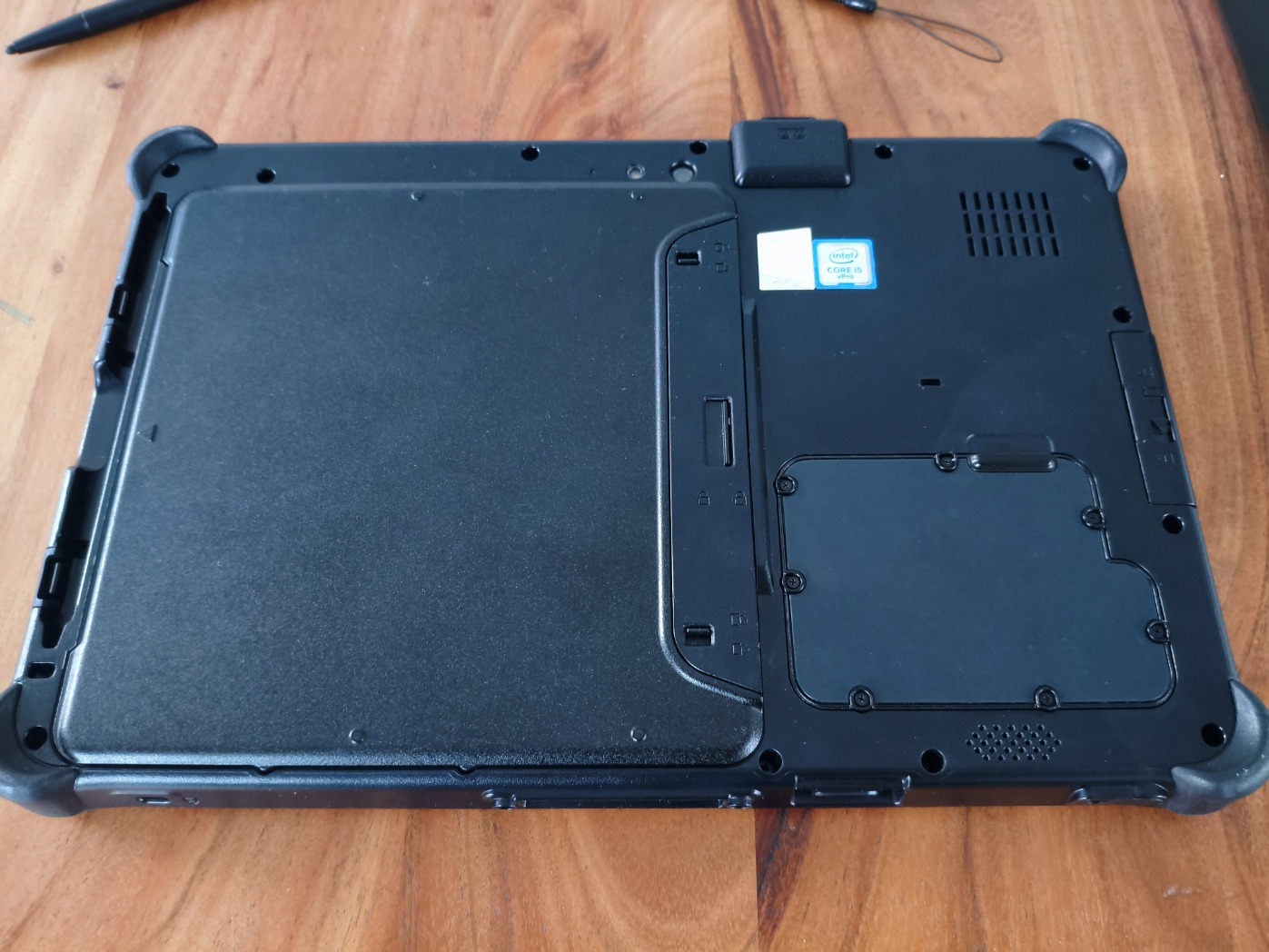 Két darab menet közben cserélhető akku van benne, együtt cirka 8 óra(!) munkát tesznek lehetővé. Gyári töltőt adok hozzá, amúgy tölthető USB-C-n keresztül is. A tablet felső oldalán, az "ExpansionBay"-ben Gigabites LAN csatlakozó van.