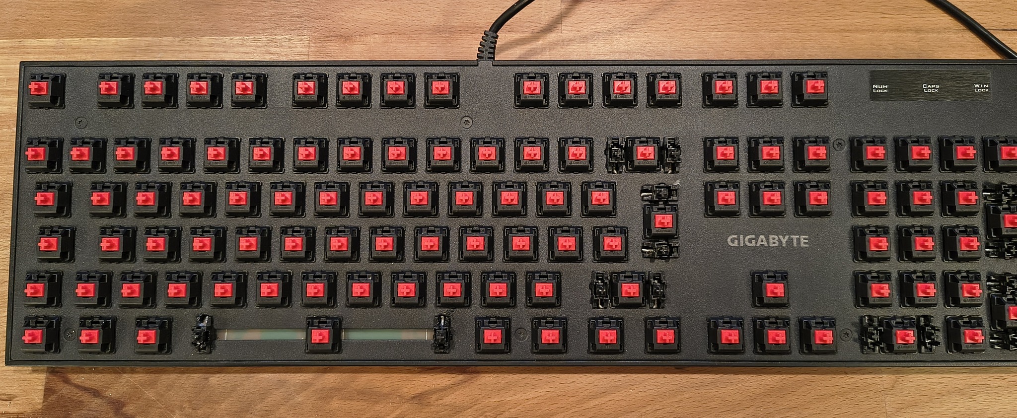 A billentyűzetnek két hibája van: nem működnek a visszajelző ledekből ketten: num lock, és a win lock. A caps lock az igen. Ez kb. típus hiba lehet, mert anno még egyet kicseréltettem (Caseking), de aztán a másodiknál (ennél) már elmaradt a garanciális csere.