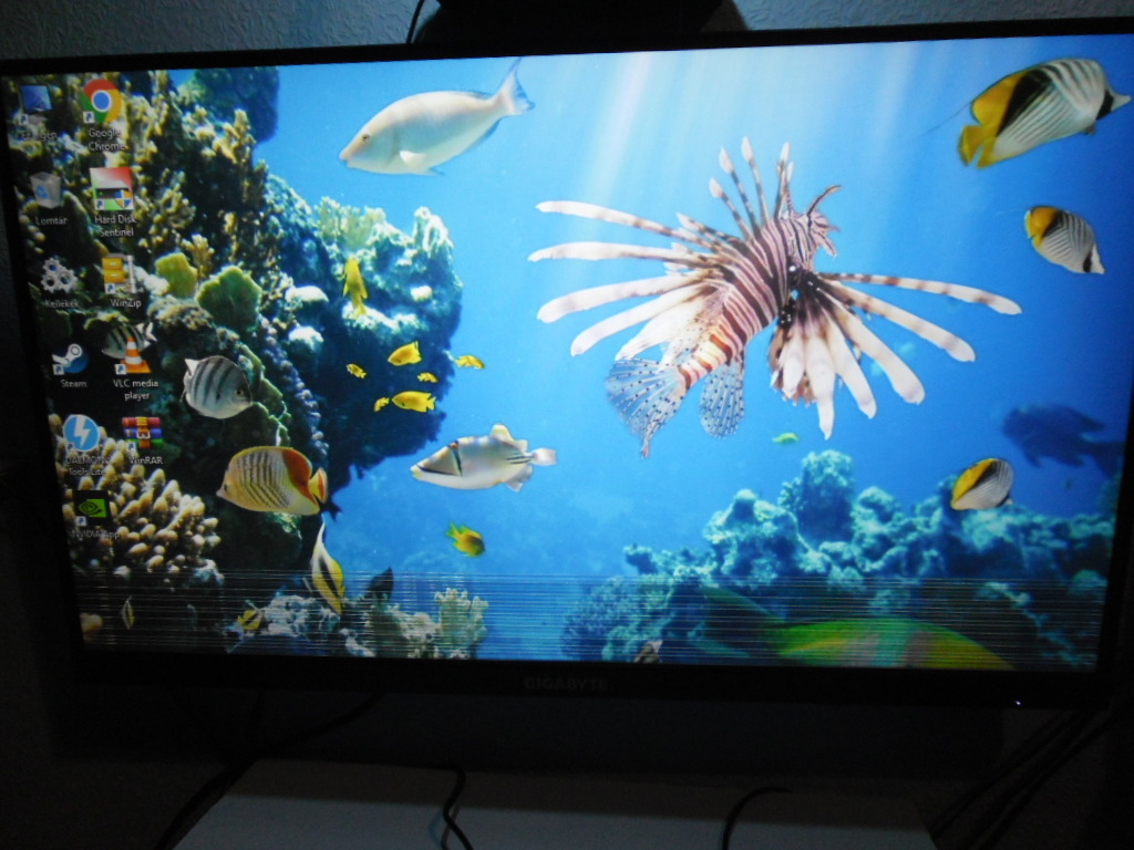 Hidegindításkor vízszintes áttetsző és villódzó csíkok jelennek meg a képernyőn (2. kép), majd ahogy bemelegszik és főként frekvenciaváltogatáskor, a képernyő aljára rendeződnek 2-3 cm magasságban. (3. kép) 170 hz-en olykor meg is szűnik a jelenség. A monitor még közel 1 évig garanciális (Utolsó képen a Gigabyte oldalán végzett garancia teszt látható), de sajnos doboz nincs hozzá, így én nem szeretnék foglalkozni ezzel, ha nem muszáj... Talpa, adaptere és HDMI kábele megvan.