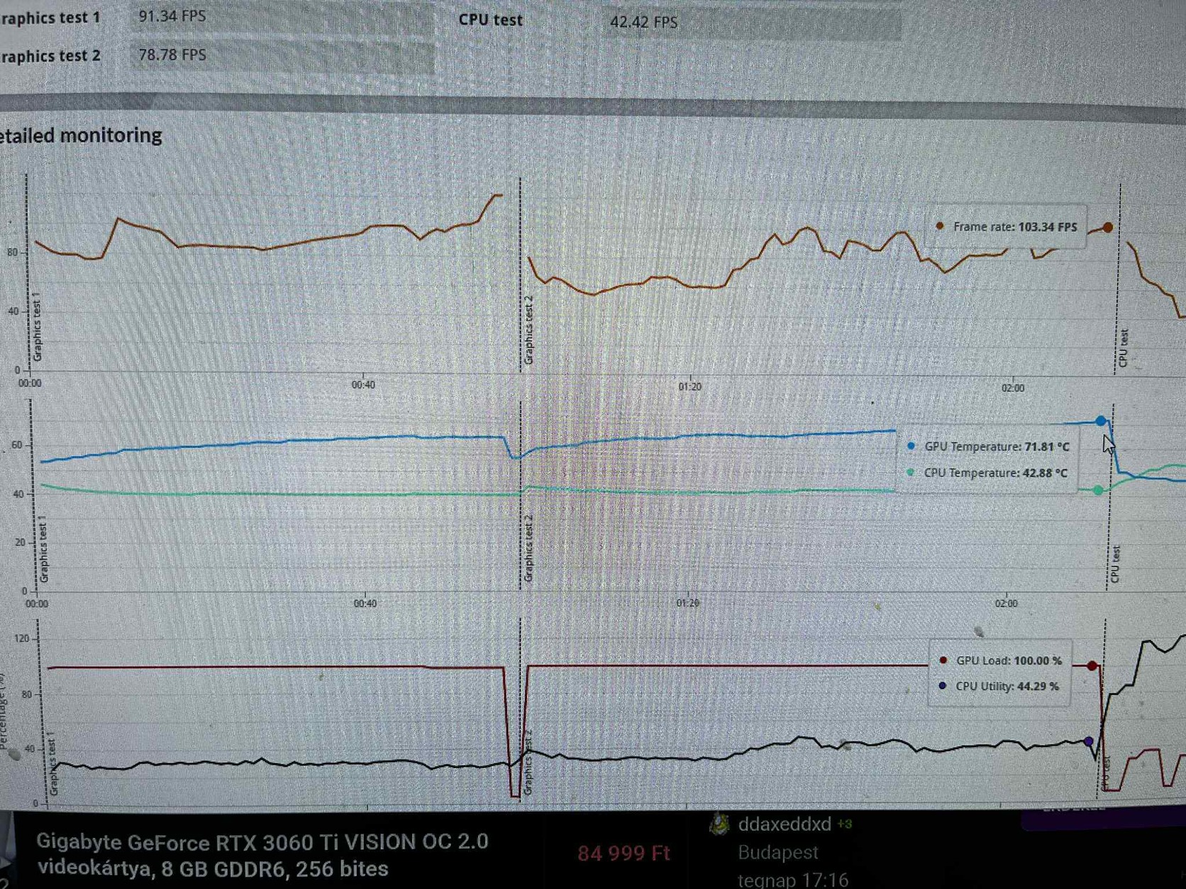 Nagyobbra váltás miatt eladó rtx 3070 kártyám. Solid undervoltal használtam ( -0,075V 1920mhz) 65 fok fölé nem nagyon láttam hogy ment volna kivéve benchmark alatt mint látható a képen time spy végére 71 fokig ment, idle 35 fok körül mozog.