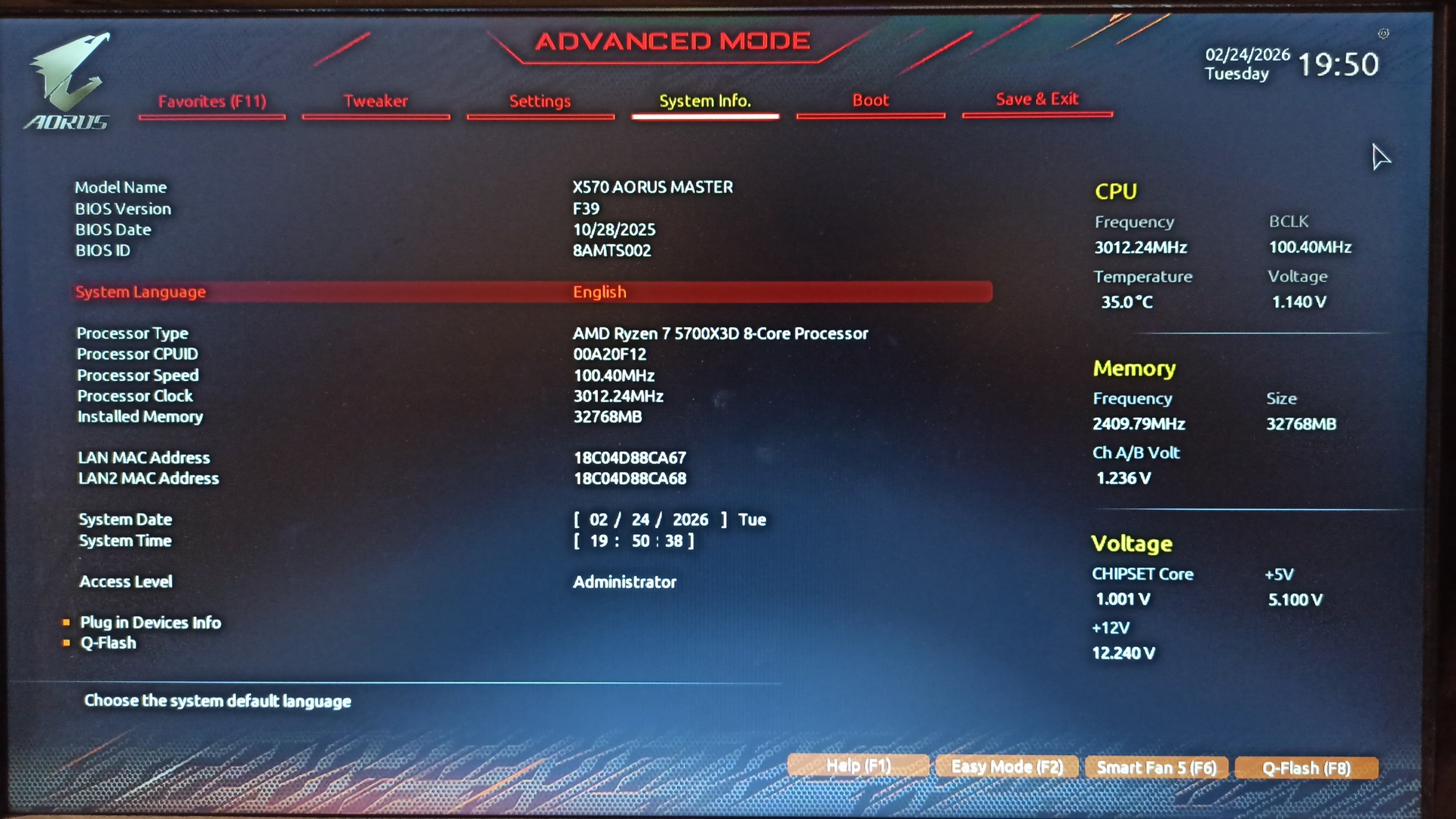 A lehetőség ellenére nem használtam túlhajtásra, egy 5700X3D volt benne alap beállítással Dark Rock Pro 4 hűtéssel. A két BIOS közül az egyik amivel használtam is a most legfrissebb F39-es.