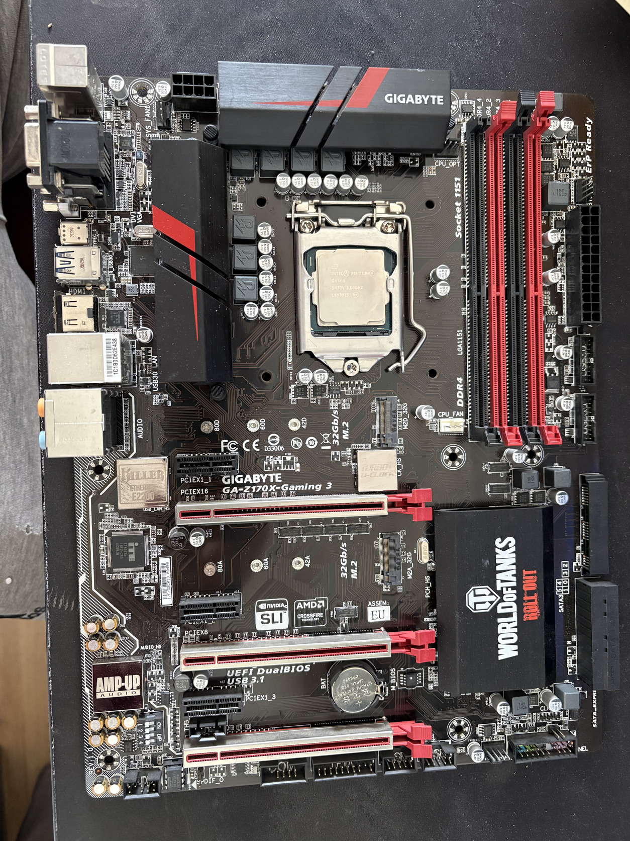 GIGABYTE GA-Z170X-Gaming 3 alaplap a képen látható állapotban eladó ajándék Intel Pentium G4560 processzorral. Takarólemez nélkül. Az egyik RAM rögzítő hiányzik, ennek ellenére stabilan megfogja a memória modult.