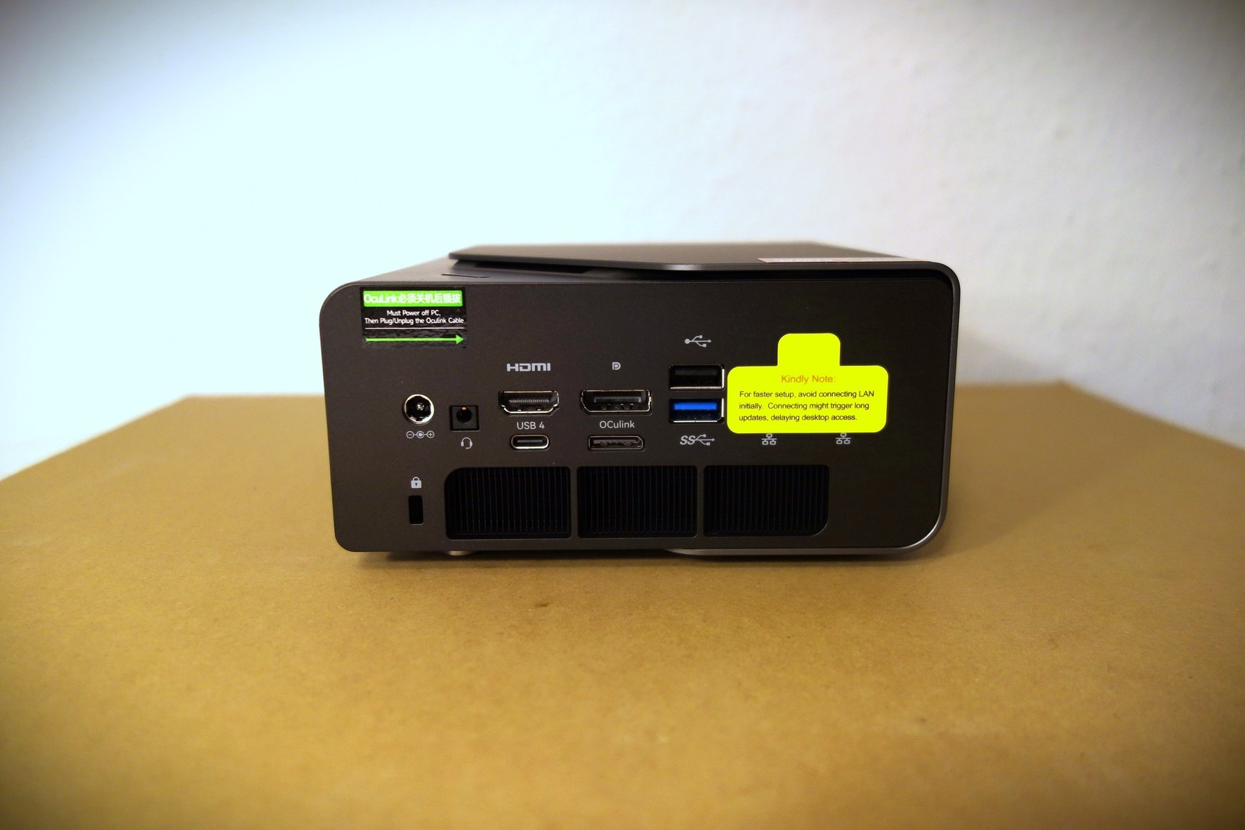 Hátsó csatlakozók: 1× USB4, 1× HDMI 2.1, 1× DP 1.4, 1× OCulink (PCIe 4.0 x4), 2× USB-A (3.2 + 2.0), fan mode button, RGB lighting effects