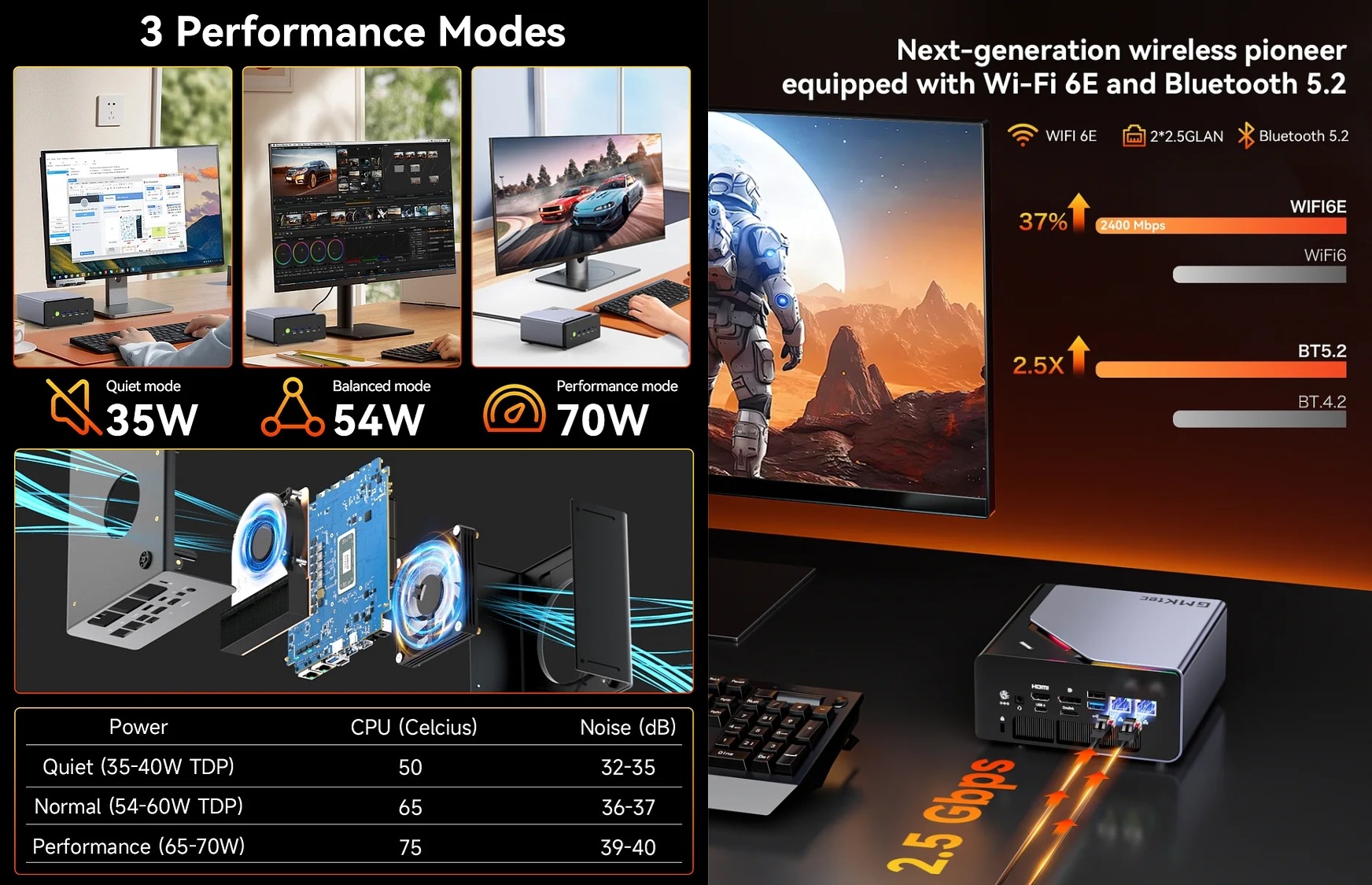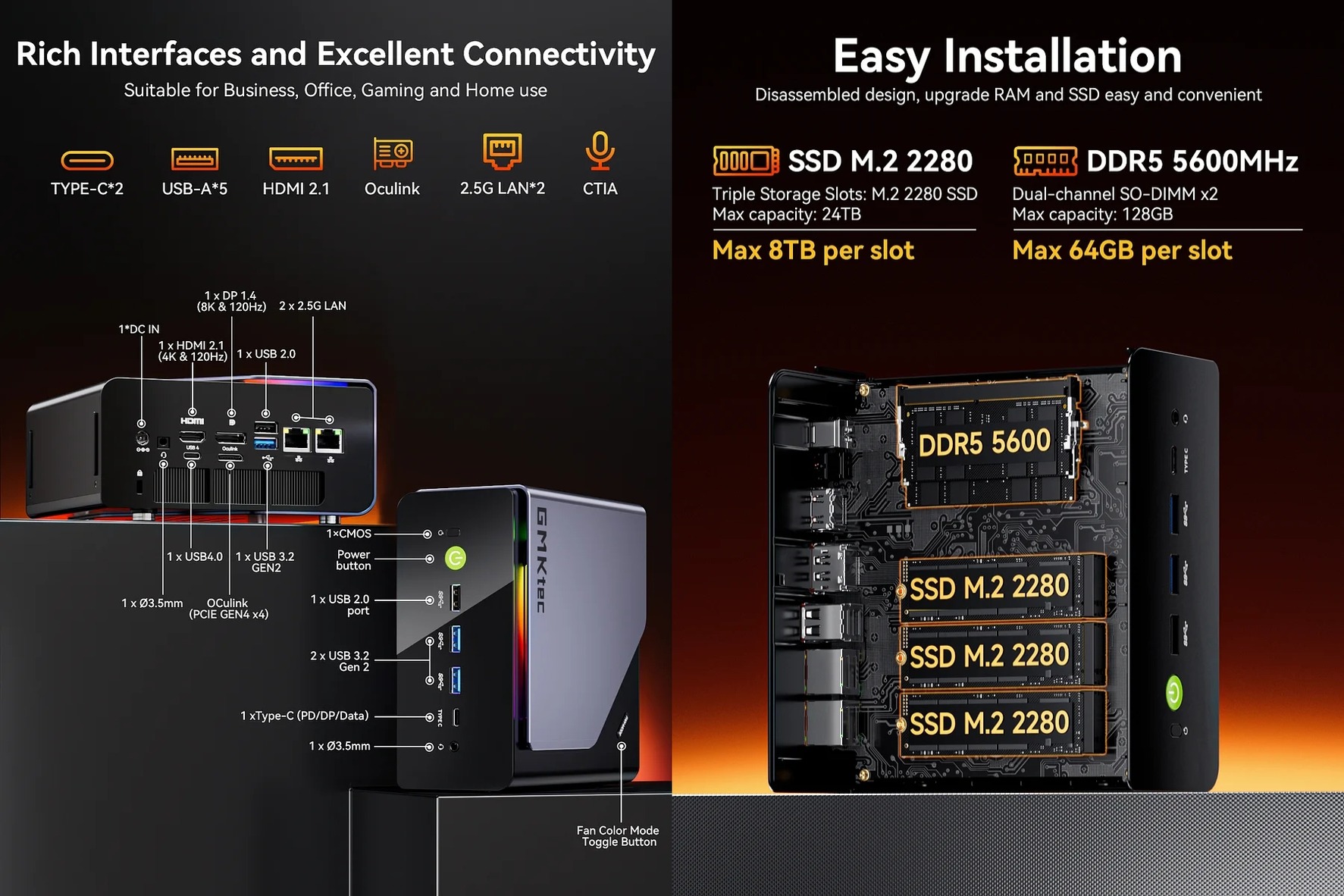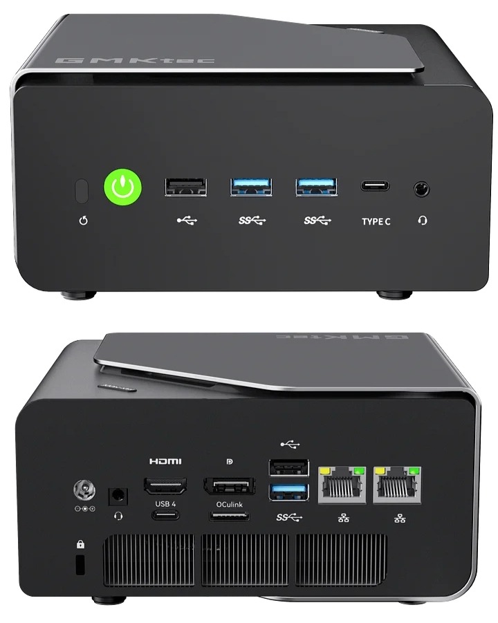 Csatlakozók hátul: 1 × DC port; 1 × 3.5mm Combo jack; 1 × HDMI 2.1; 1 × DP 1.4; 1 × Oculink (PCIe Gen4×4; külső VGA csatlakoztatásához); 1 × USB3.2 Gen2 + 1 × USB2.0; 2 × 2.5G LAN (Realtek 8125BG); Fan/LED control button