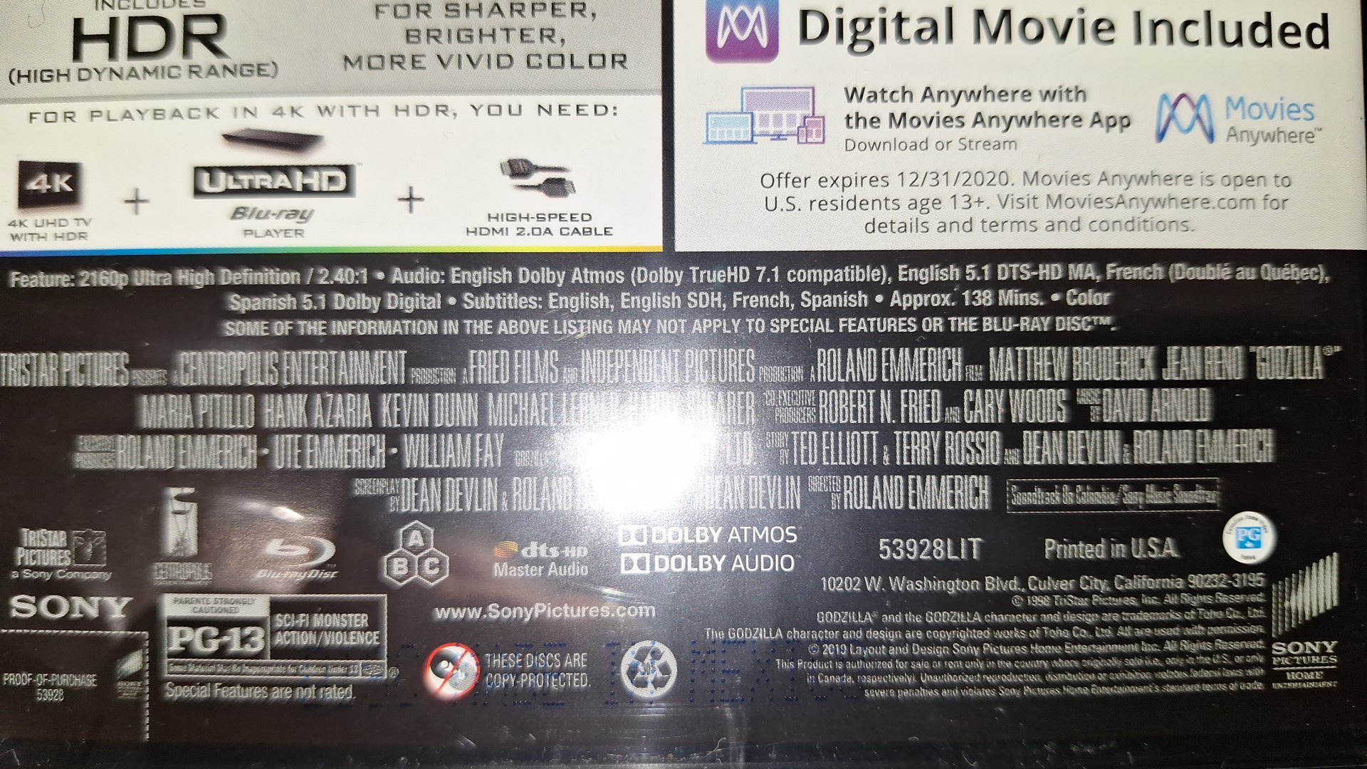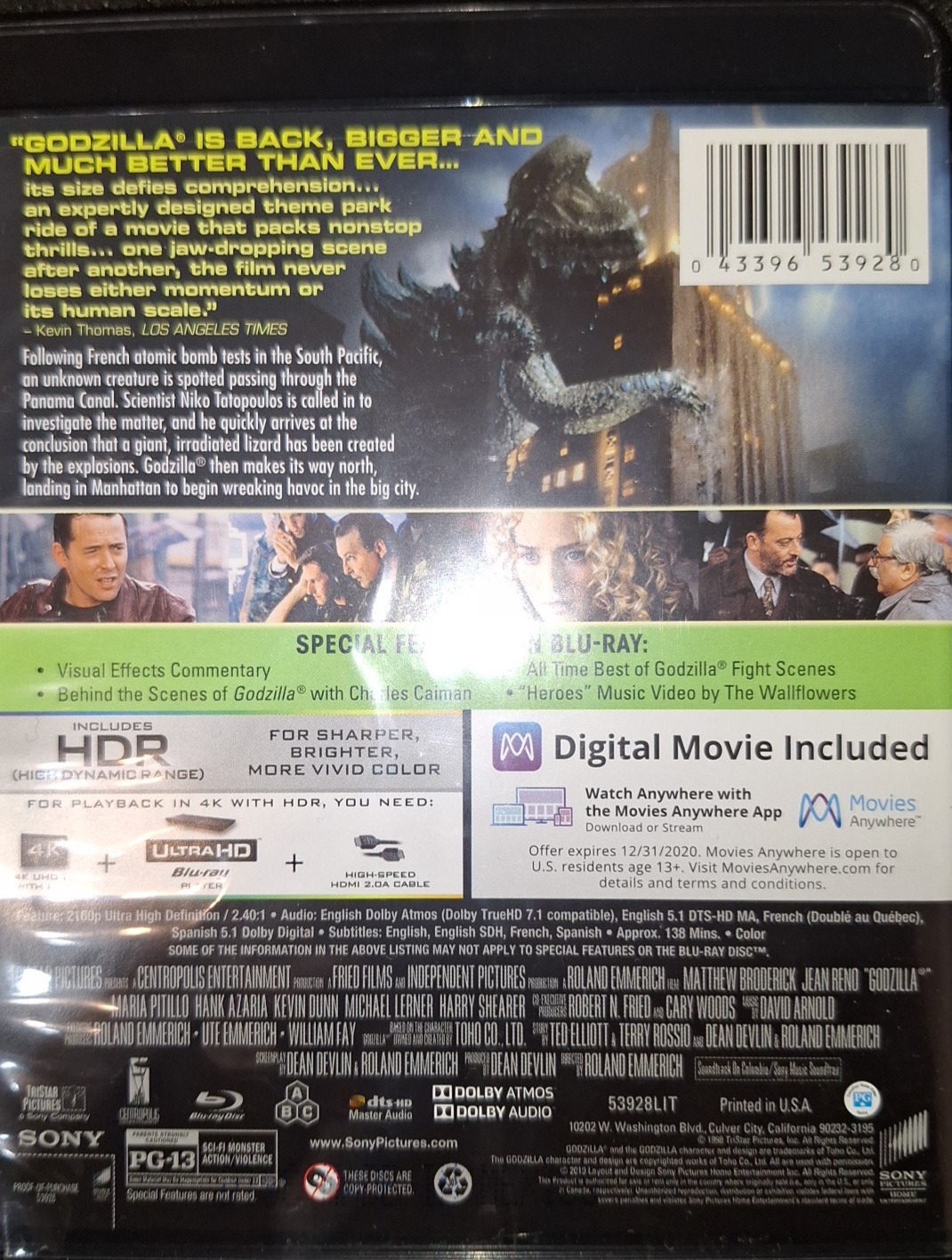 Godzilla (1998) 4K UltraHD UHD + Blu-ray, angol