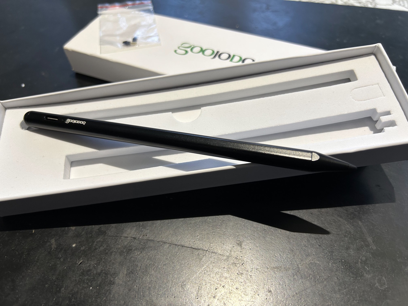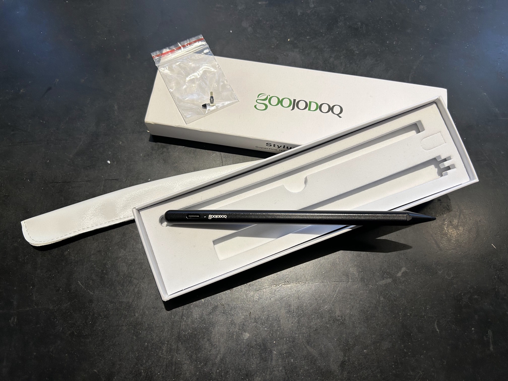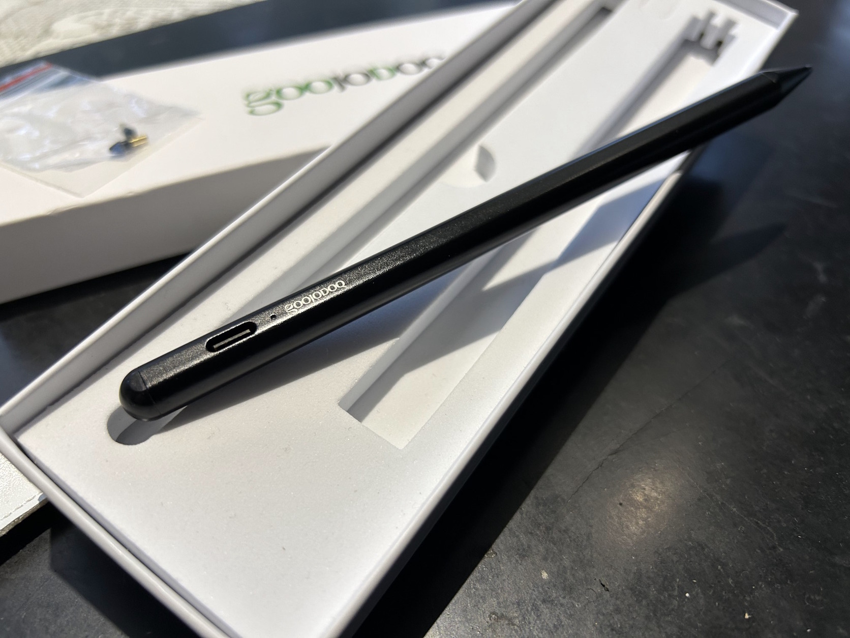 Két új heggyel. Maga az eszköz mágneses szóval ott marad a tablet oldalán. Type-C-vel lehet tölteni. Van hozzá kis kábel is.