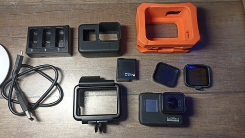 Eladó használt GoPro Hero 7 Black kamera a képen látható kiegészítőkkel.