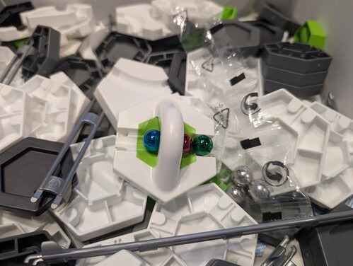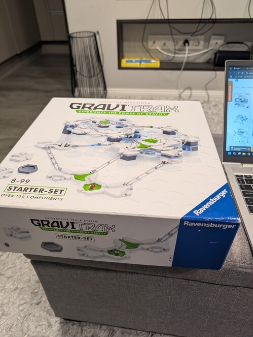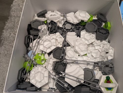 A Gravitrax 100 darabos kezdőkészlet, párszor szétszedtünk és játszottunk vele, a korongok és lapkák kibontásra kerültek.
