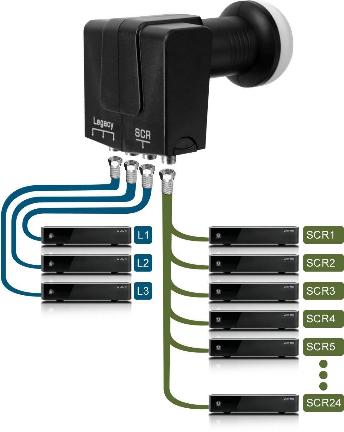 A GT-SAT ezen LNB-jével egyidejűleg akár 24 résztvevőt is elláthat egy koaxiális kábelen és további 3 résztvevőt a hagyományos (legacy) kimeneteken keresztül. Minden résztvevő hozzáfér az összes programhoz és a műhold teljes frekvenciaspektrumához.