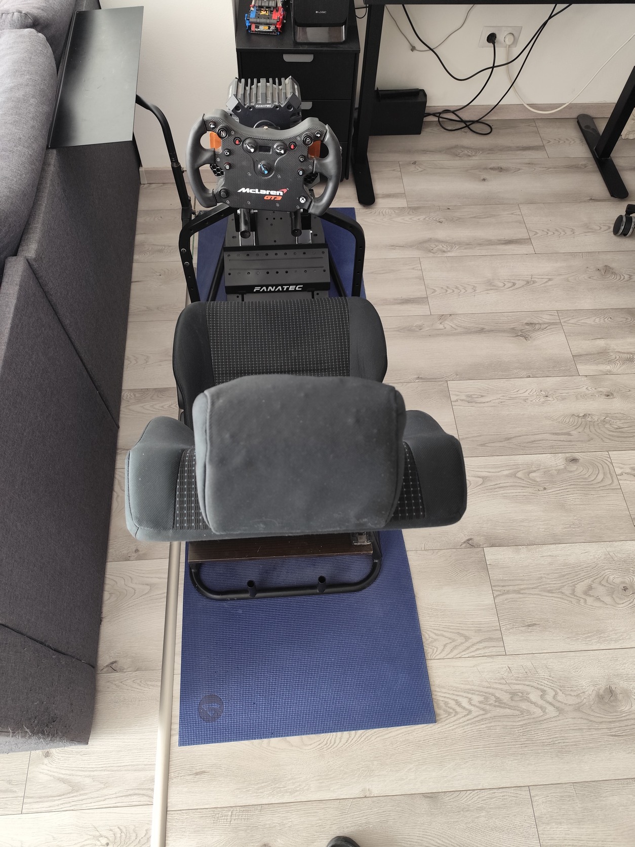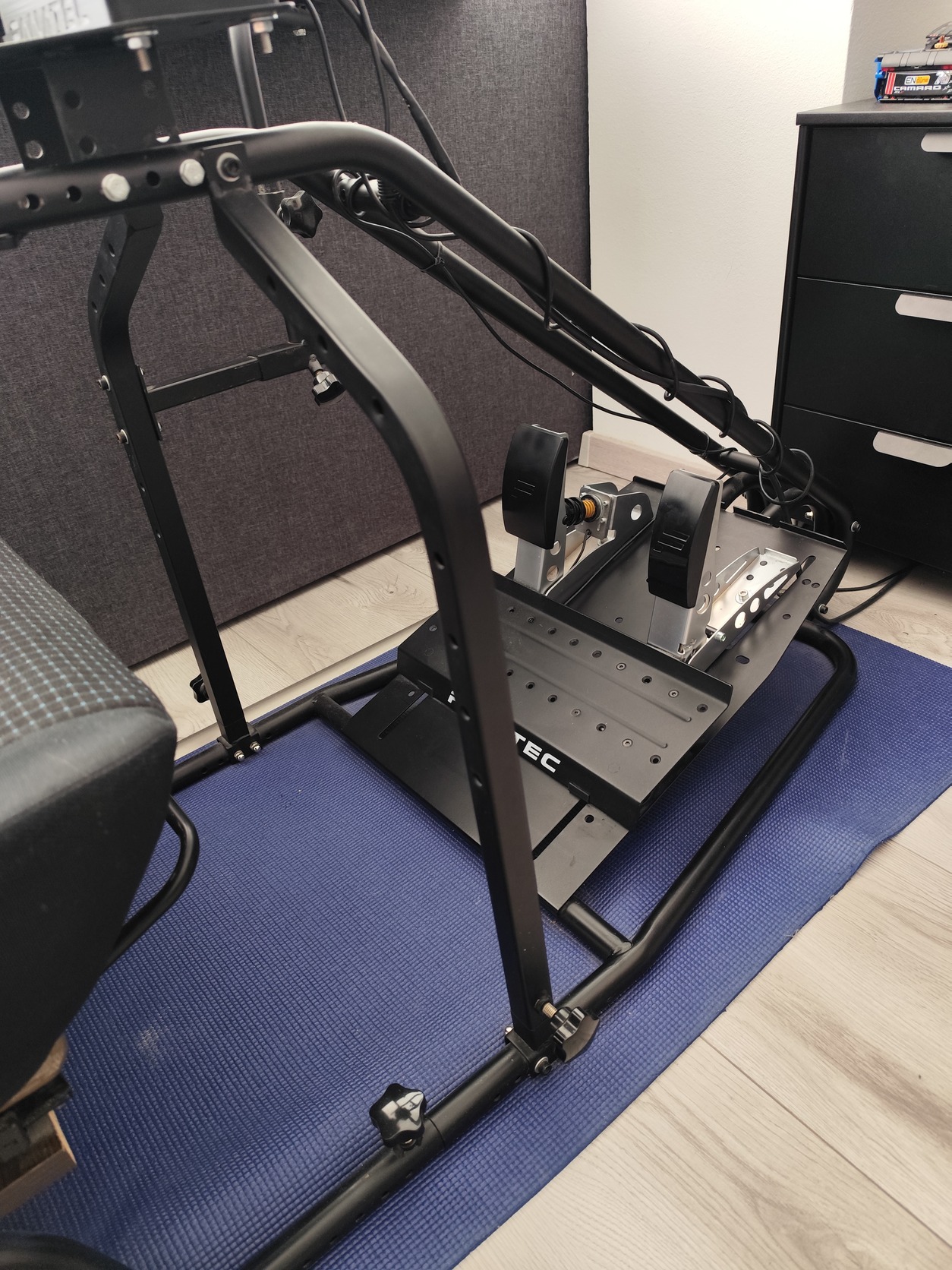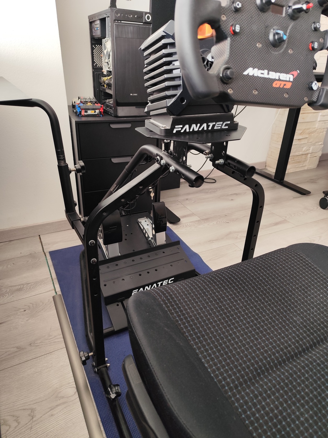 Jelenleg egy 8Nm-es Fanatec DD-vel van használva,amit stabilan tart,illetve a loadcelles pedált is stabilan tartja a pedáltartó.