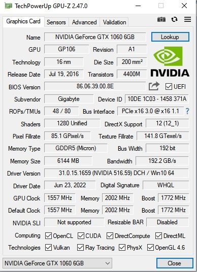 Gigabye GTX 1060 6GB