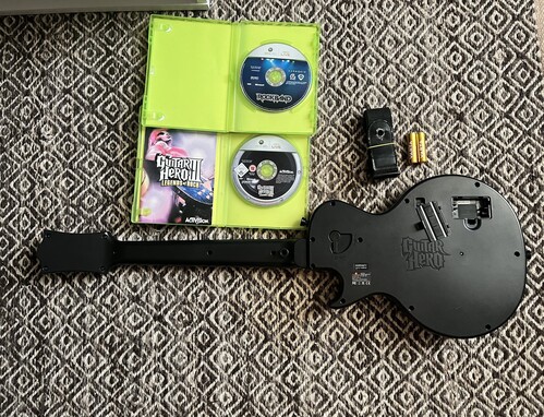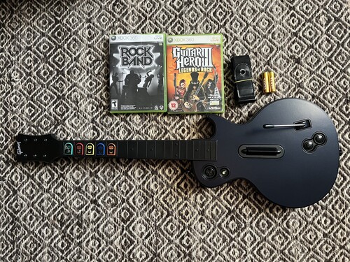 Eladó a képeken látható Guitar Hero Gibson gitár. A gitár tökéletesen működik Xbox360-on, illetve PC-n is. Beleértve a tremolót, a gombokat és a giroszkópot is. Az ár tartalmazza a hevedert, a gitárt, illetve új 2db elemet, 2db eredeti játékot. PC-n való használathoz szükség van egy wireless adapterre.