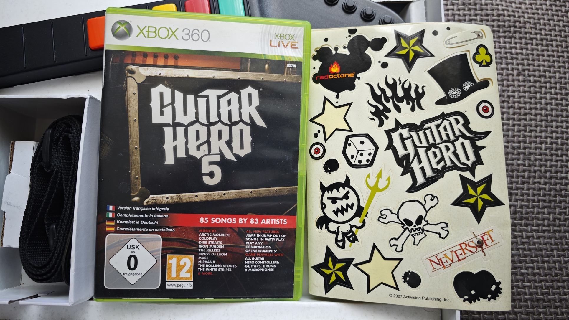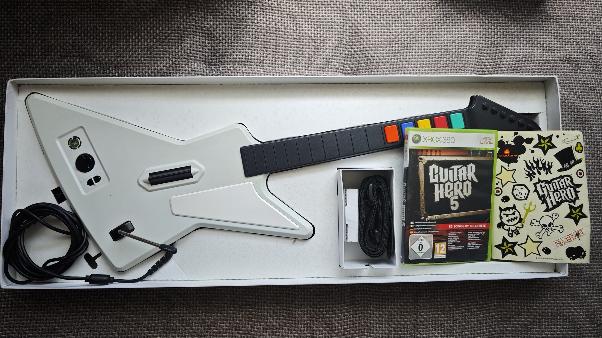Xbox360-on és PC is működik, csatlakozása USB. Clone Hero-val is tesztelve, semmi extra beállítás nem szükséges, mivel vezetékes azonnal felismeri minden játék. Tartozék egy eredeti vállpánt is. Játékból választható más is.