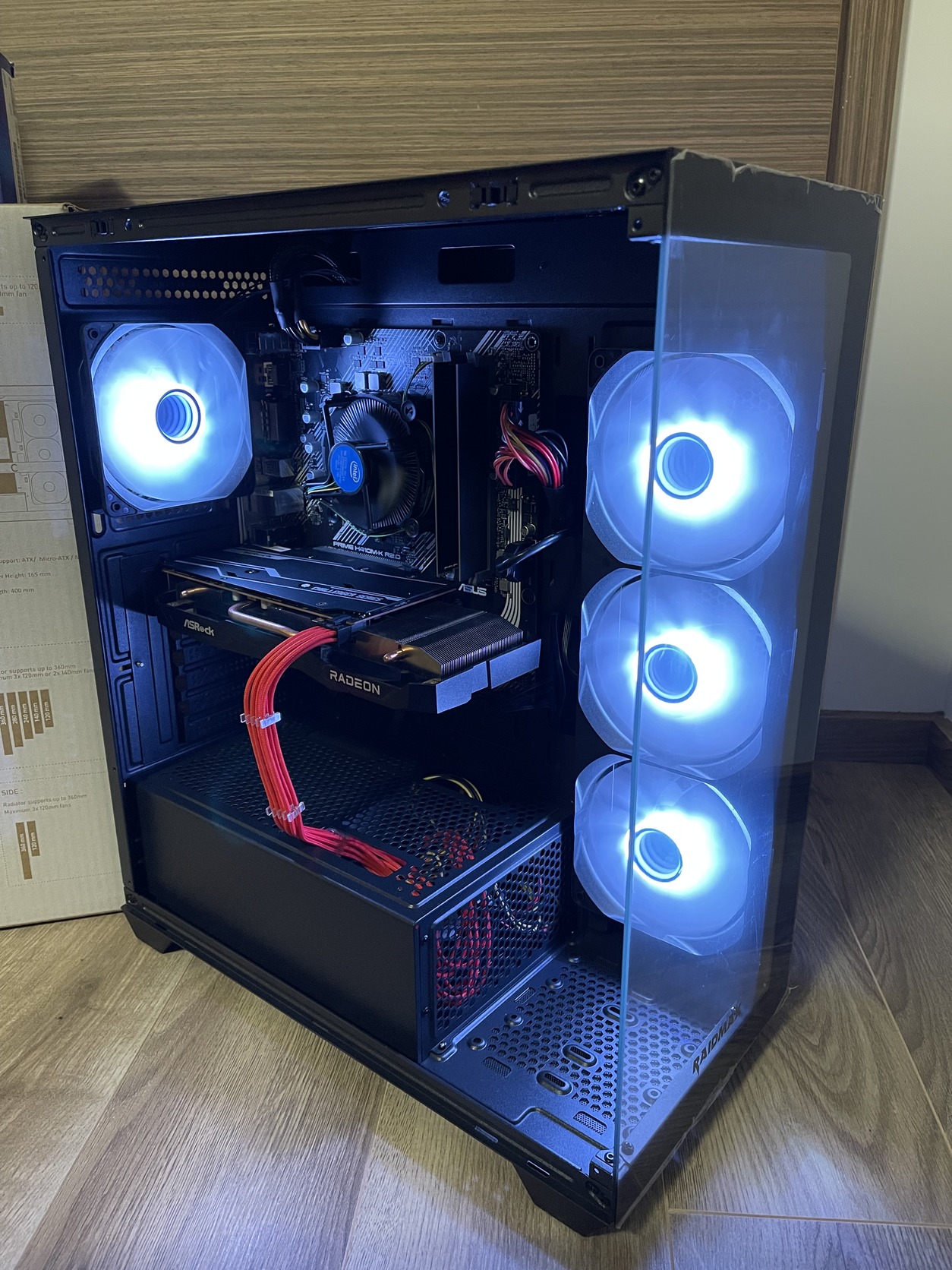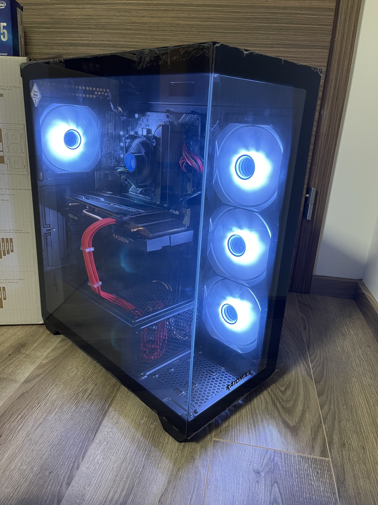 Ház: Raidmax i800 4db vezérelhető infinty tükrös, RGB-s ventillátorral, fóliás edzett üveg oldallal.
