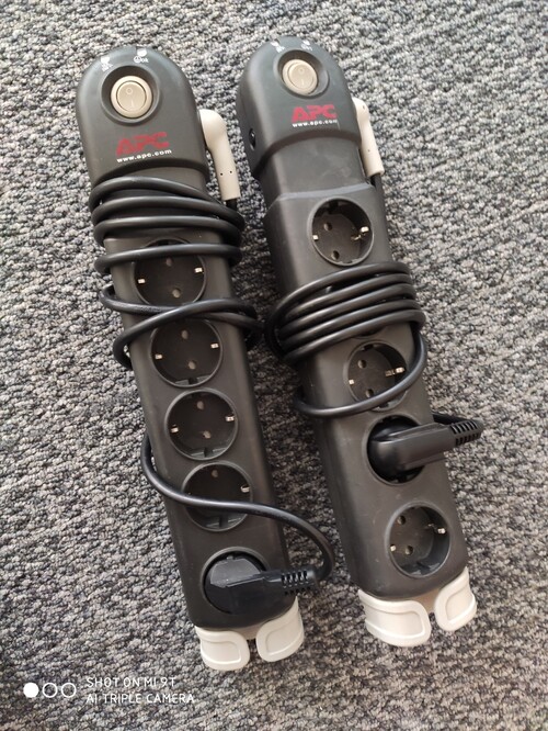Eladó 5 részes APC Essential SurgeArrest 5 típusú 230 V túlfeszültség védős (1 plc kompatibilis) hálózati elosztó, hosszabbító. Több darab, használt jó minőségű. 3000ft/db.Főbb jellemzők:5 AC kimenet, kapcsológomb, 1,83 méter kábelhossz, túlfeszvédő, 180 fokban elforduló kábelrögzítő, hibajelző led, 50-60Hz, 230V,