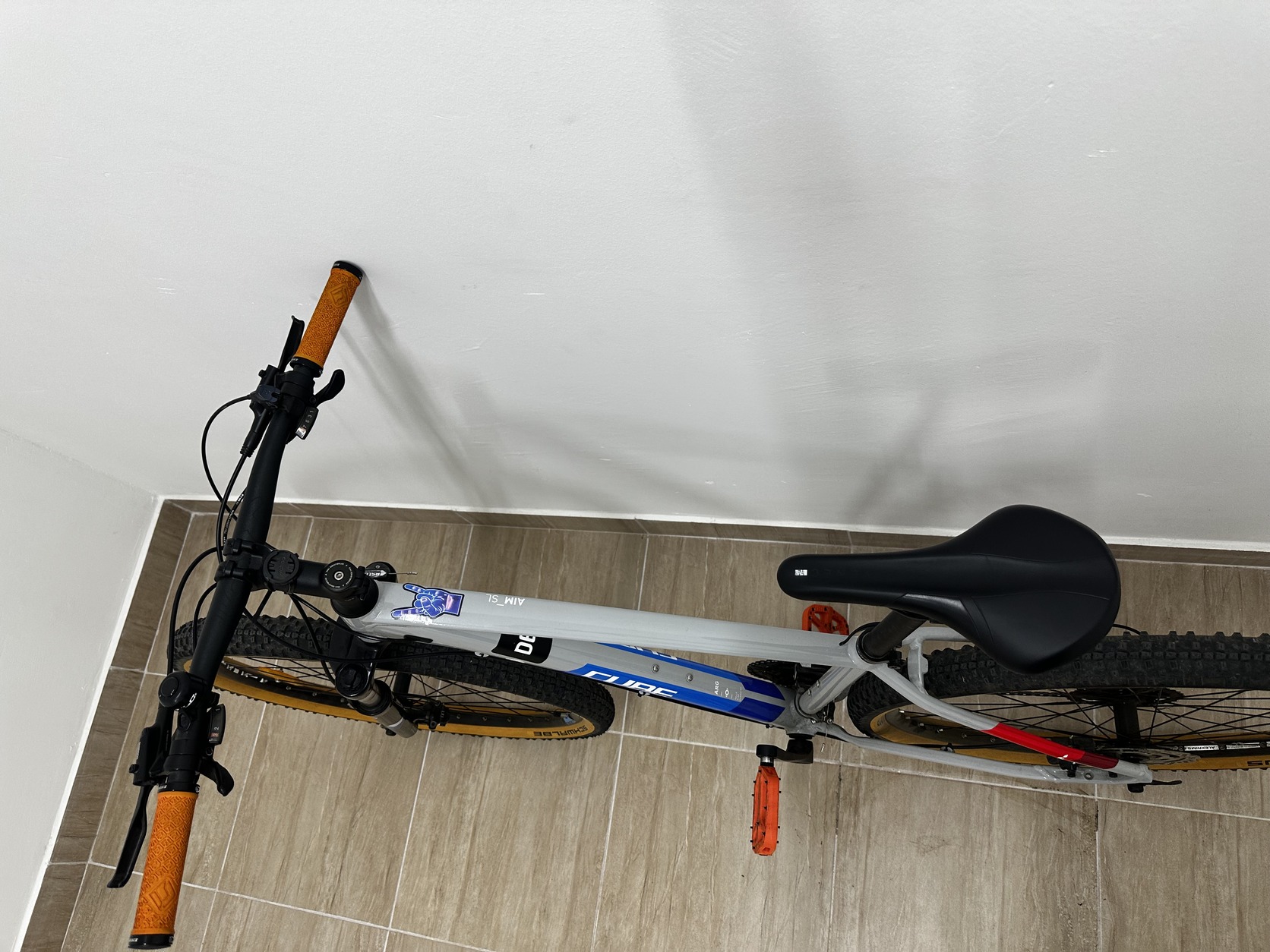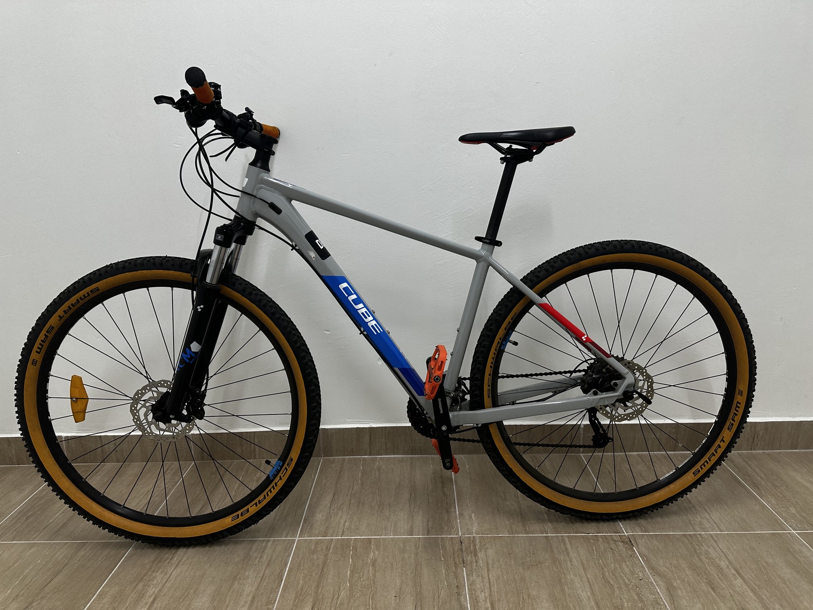 Eladó egy 2021-es Cube Aim SL hegyikerékpár L-es vázméretben, szürke/kék/piros színben.