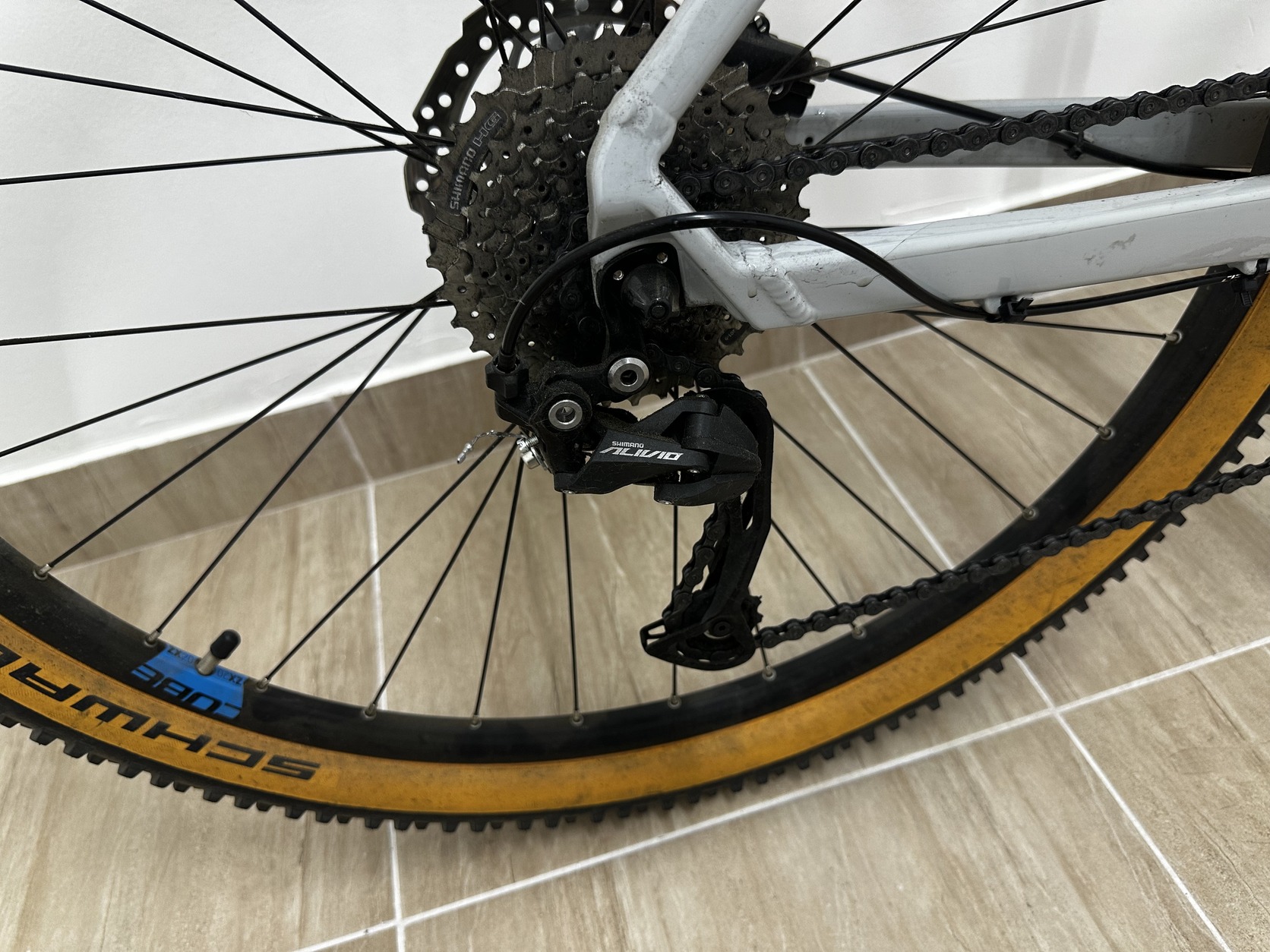 27 sebességes Shimano hajtáslánc – az első váltó gyári Altusról Aliviora cserélve (egy kategóriával jobb)