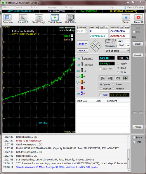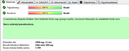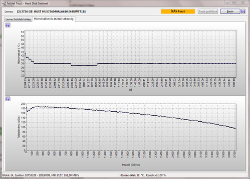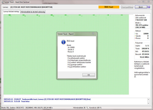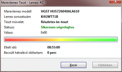 Teljes írás-olvasás felületteszt, Butterfly teszt és Részletes önteszt lefutott. A lemez elején problémás az írás, ezért úgy formáztam, hogy az első 100GB ne legyen használva.