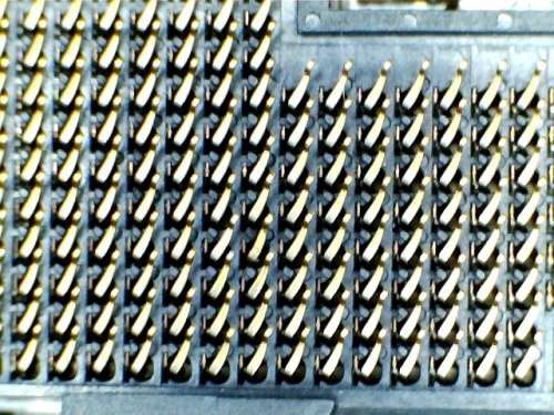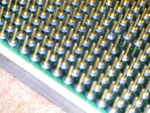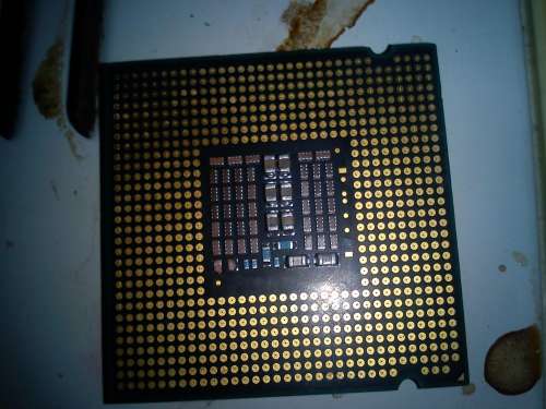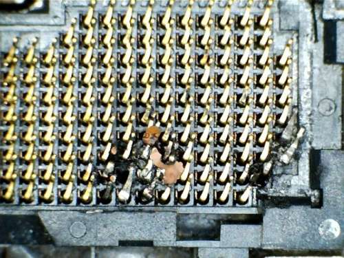 Itt egy tipikus "szakember csinálta munka megint" és egyben brutális példa arra hogy mi történik akkor ha cin kerül a processzor és a foglalat érintkezői közé vagy nem jól vannak beállítva a javított lábak.Idővel a kettő összeolvad és csak kitépni lehet a processzort a foglalatból.(a proci leégett darabjai jól látszódnak a lábak végein)