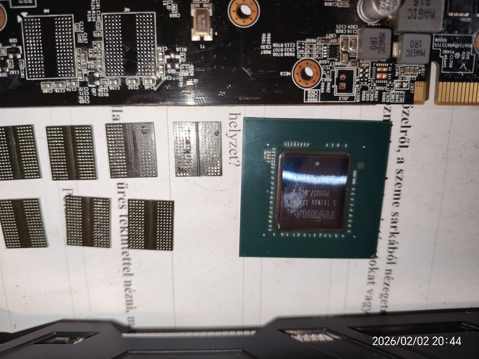 Az összes memória zárlatos, GPU chip is magáért beszél. memória tápnál mosfet zárlat, a hibás fetet is leszedtem.