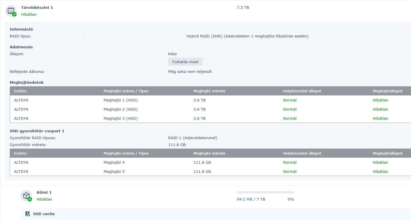 data disk: 3 * 4TB Seagate ST4000DM000 (Hybrid RAID , 1 lemez meghibásodás tűrés, ebben a konfigban 7TB)