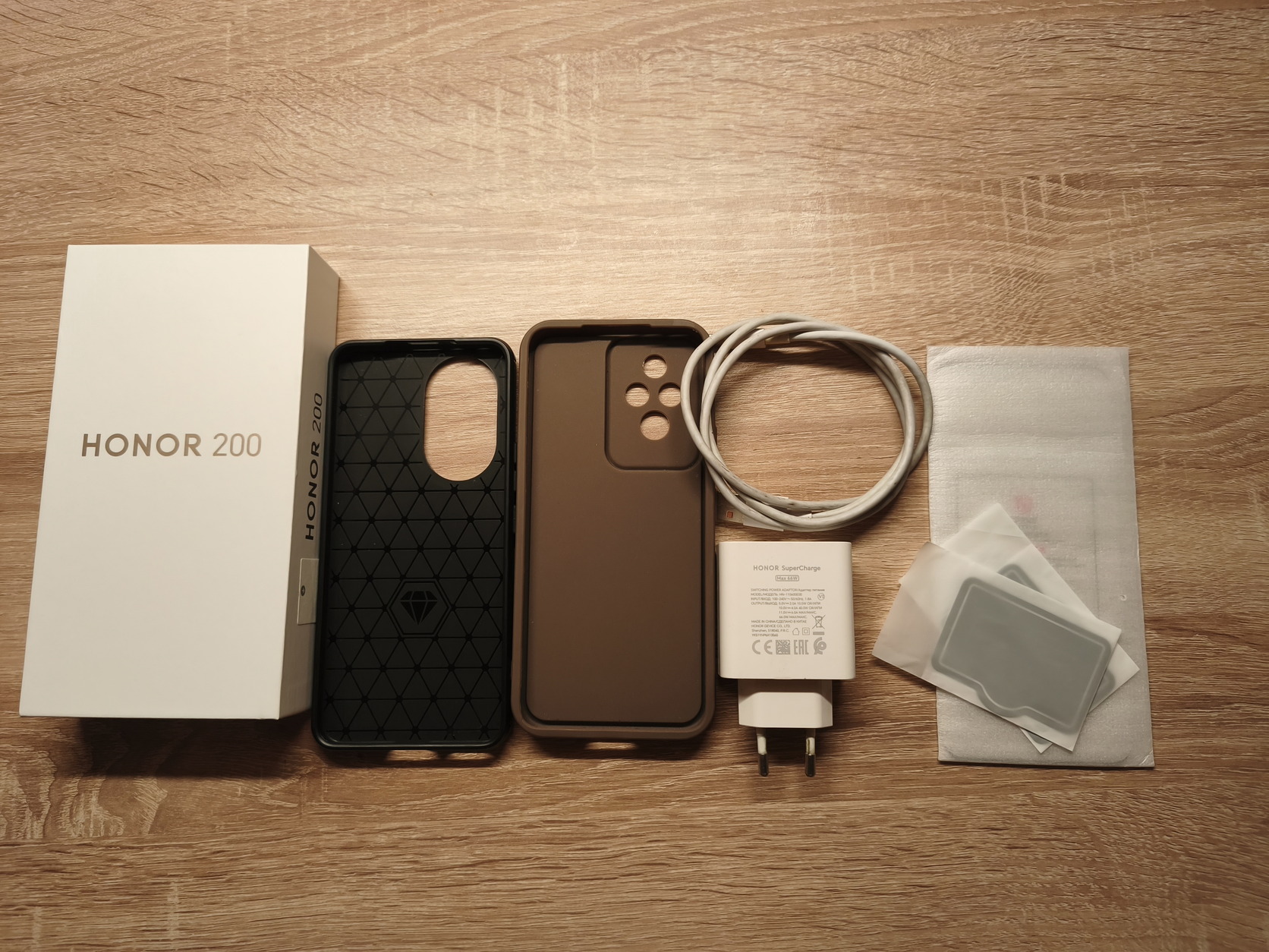 Doboz,66W töltő,kábel,kettő darab tok,kijelzővédő és kameravédő jár hozzá.