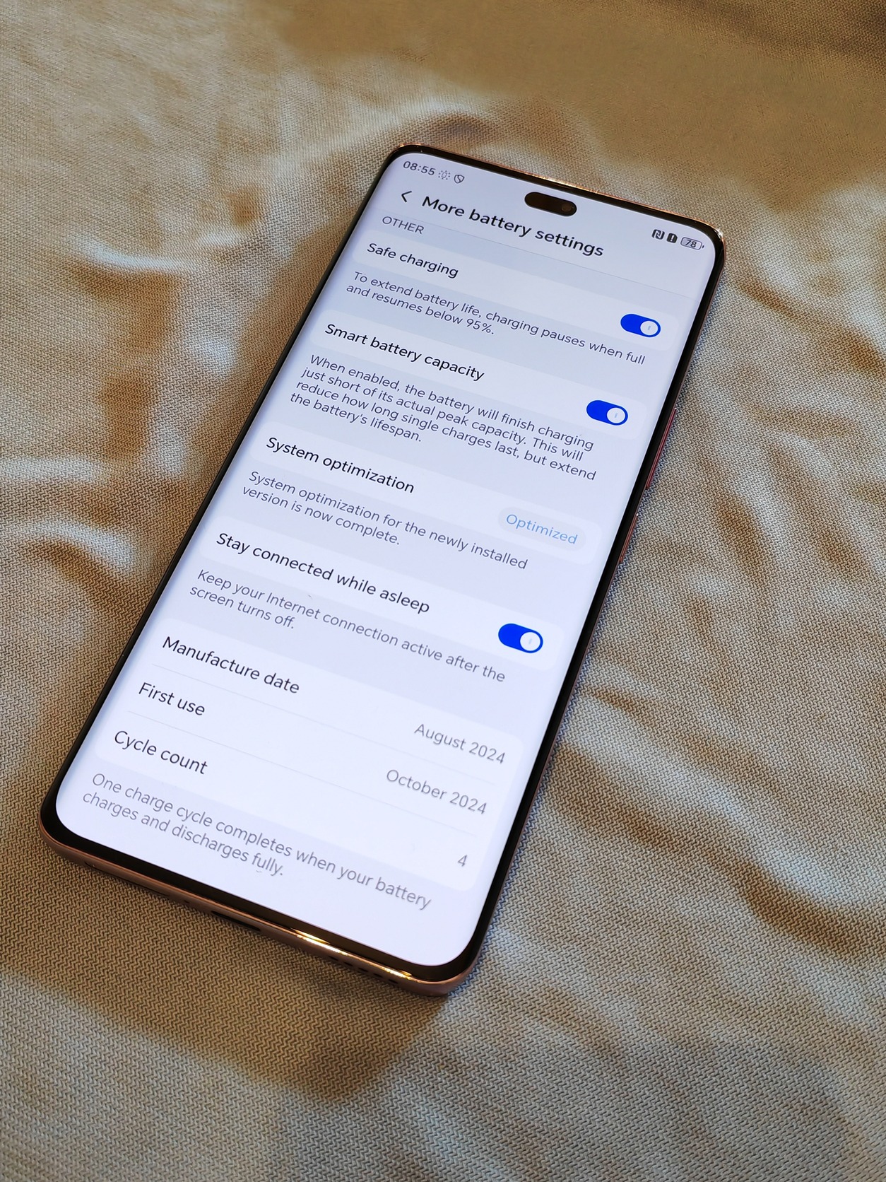 Az akkumulátorban mindössze 4 töltési ciklus van és 100%-os kapacitás. Kijelző teljesen karcmentes. A hátlapon nagyon minimális karc.