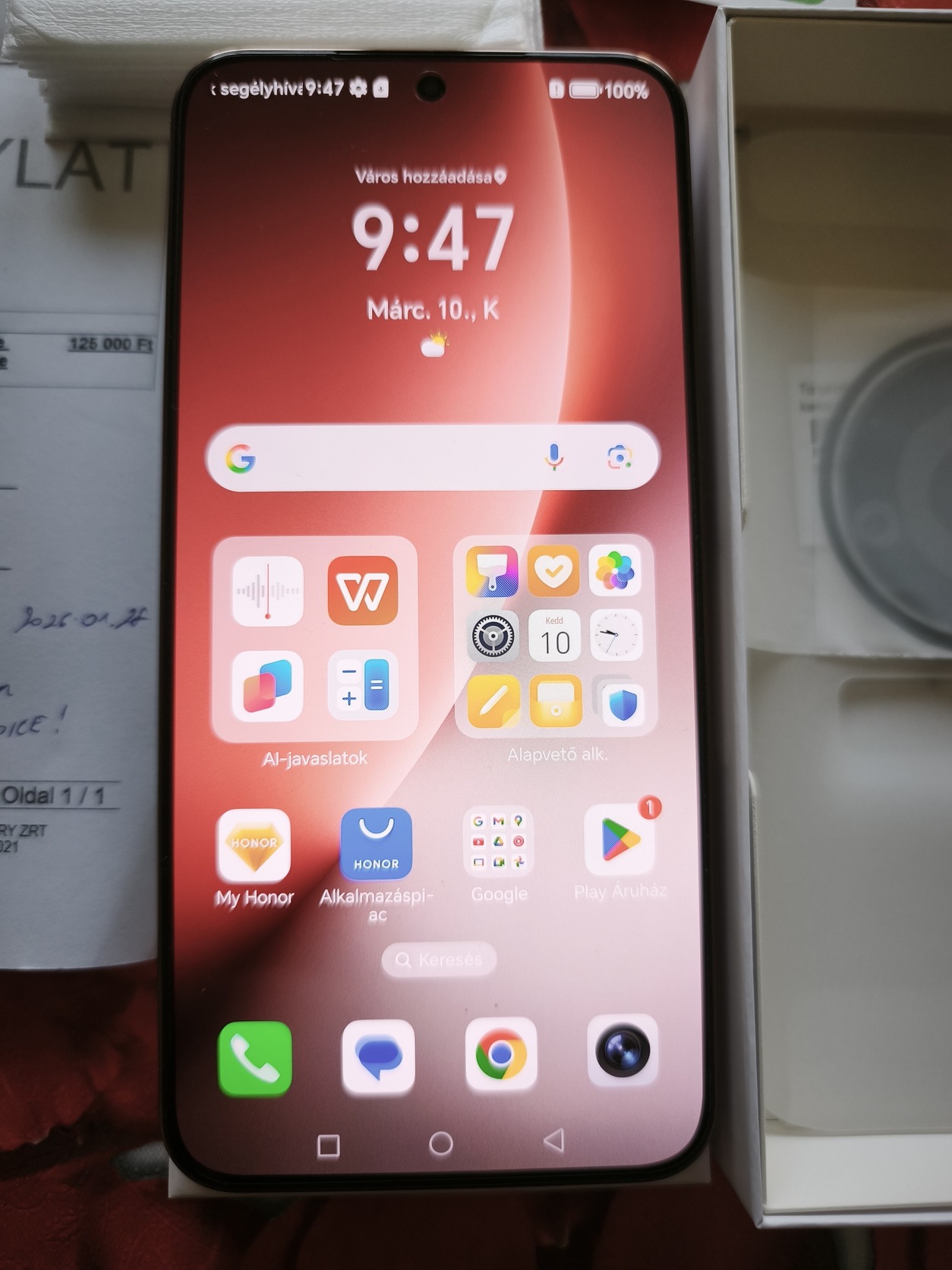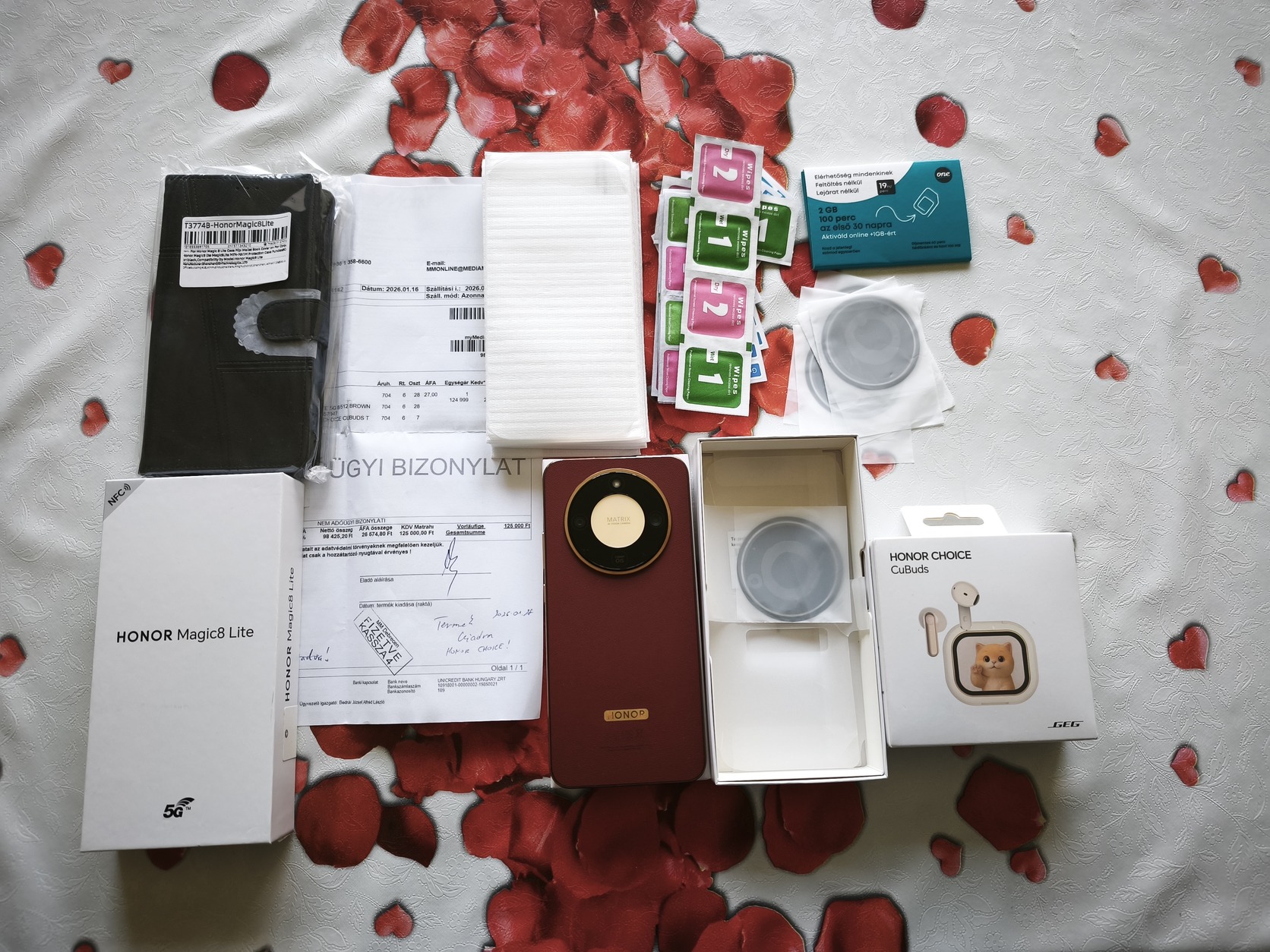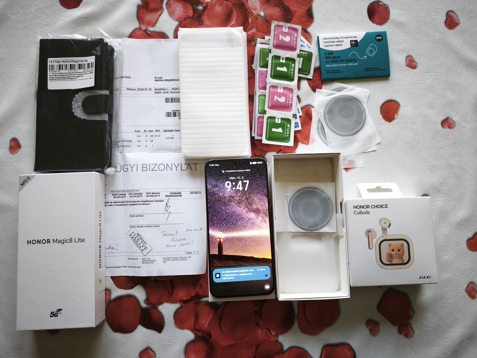 Rengeteg ajándékkal: Honor Cubuds Bluetooth headset (bontatlan), 8 darab üvegfólia, több darab kameravédő fólia, egy darab bontatlan fekete színű bőr fliptok és ajándék One SIM kártya.