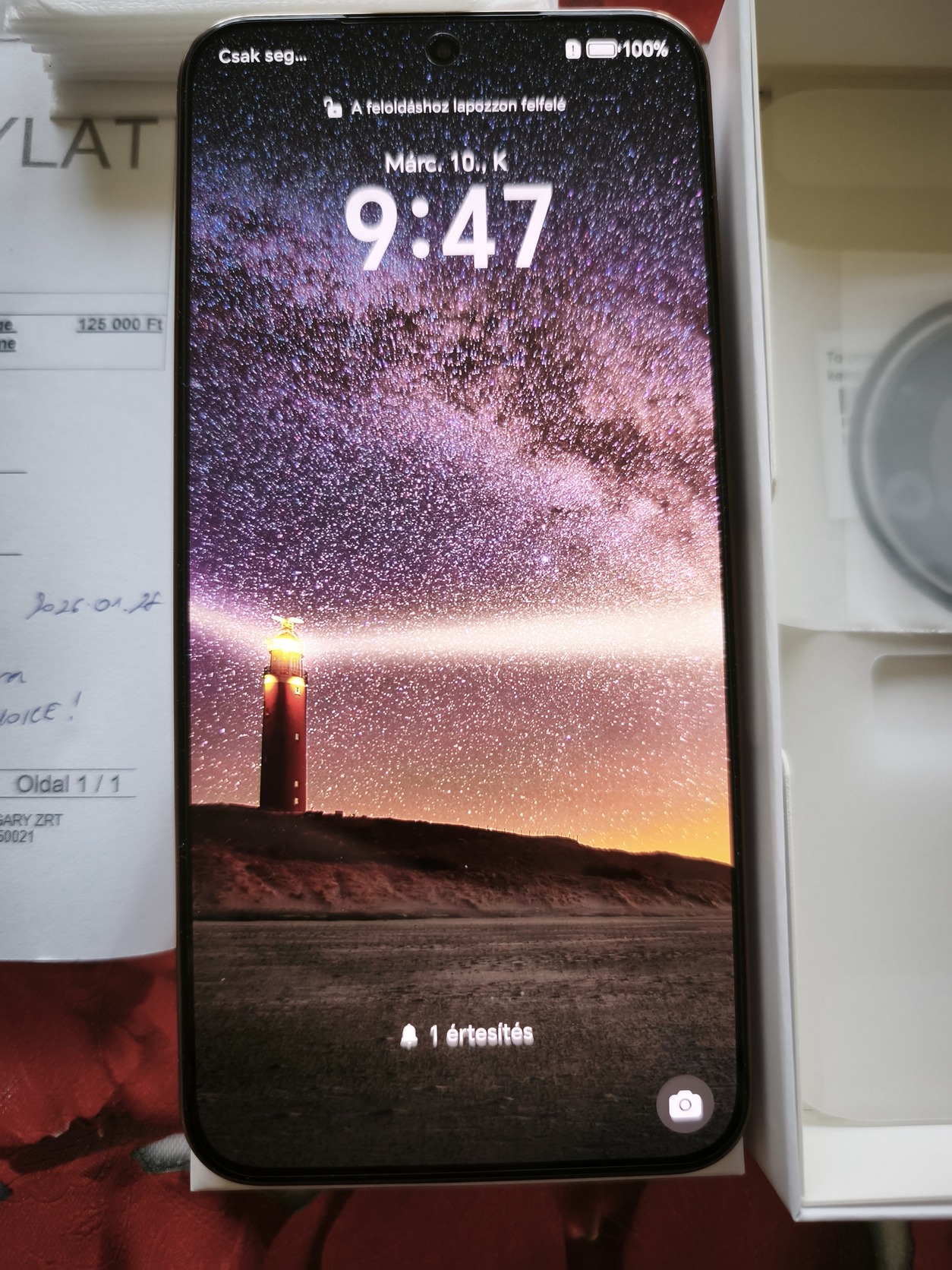 A kijelzőn még a gyári fólia van.