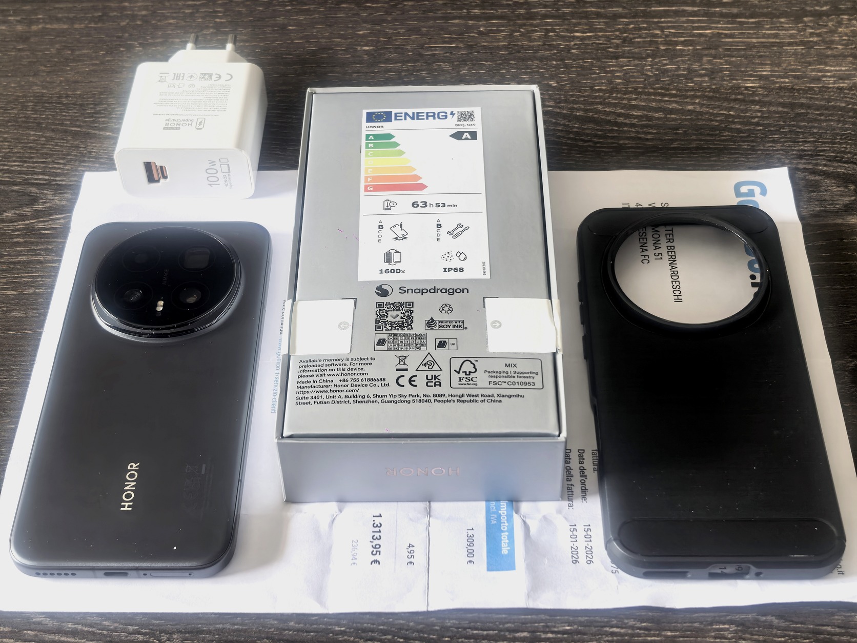 Doboz és tartalma, bontatlan adatkábel és simtű, 100 wattos Honor SuperCharge töltő (maximális töltési sebesség eléréséhez), Carbon mintás tok és a vásárlást igazoló számla.