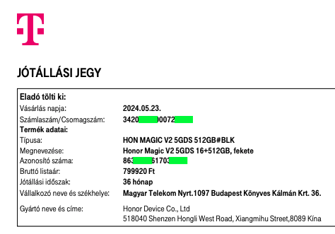 Telekomtól vásárolt (gyártó hivatalos partner) jótállás érvényessége: 2027.05.23.