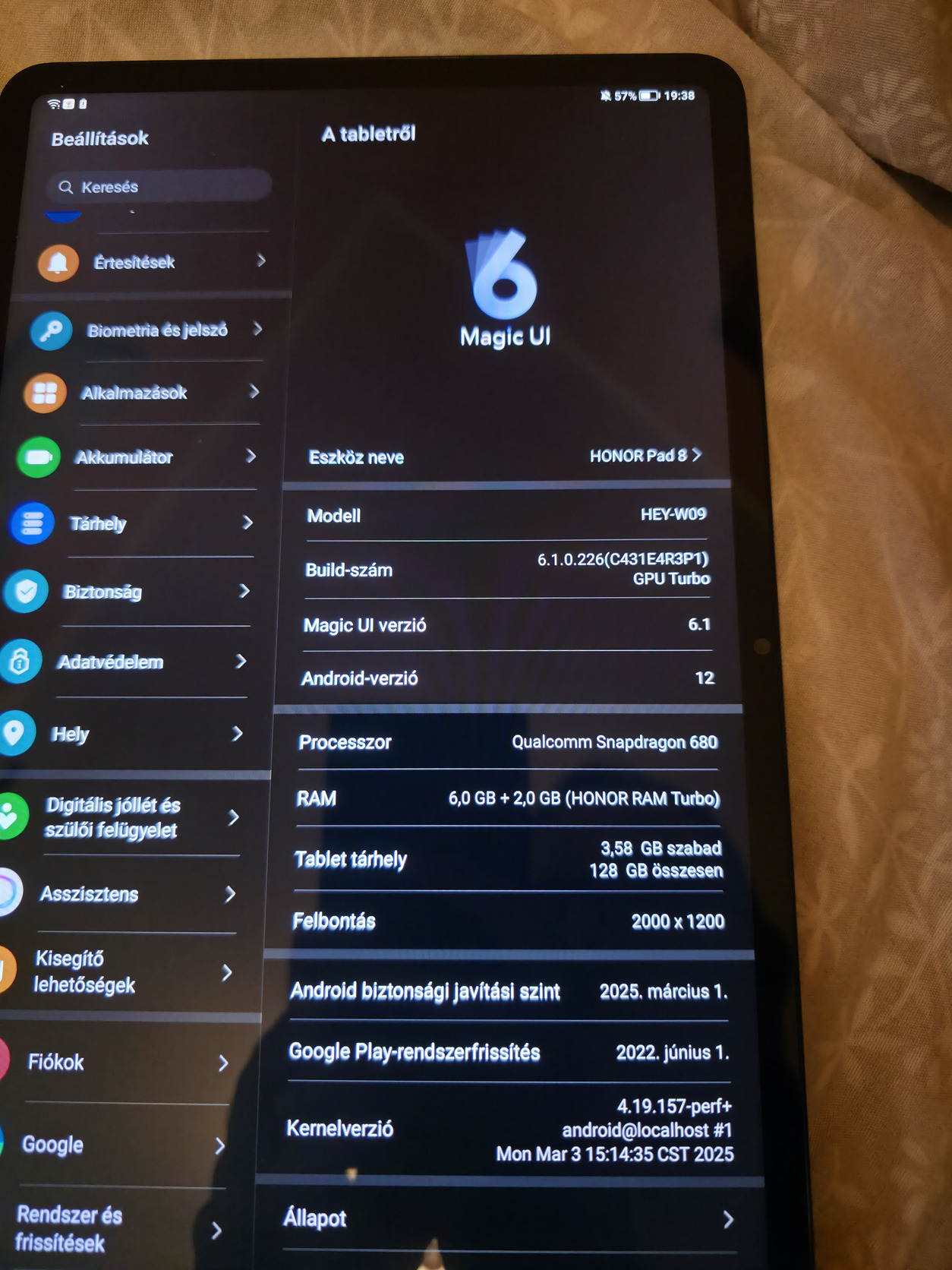 Honor pad 8 12" 6gb ram 128gb tarhely