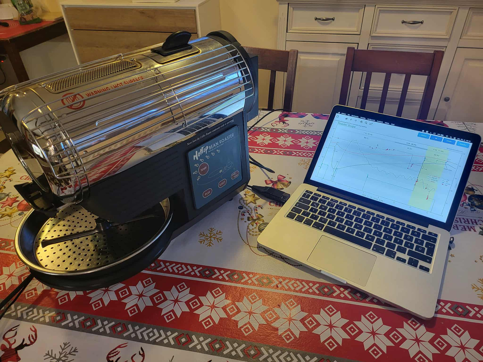 Eladó egy felújított, Artisan kapcsolatra felokosított Hottop kávépörkölő. A készülékbe utólag Arduino vezérlés, ventillátor vezérlés, SSR fűtőszál vezérlés, bab és környezeti K hőelem lett beépítve. A készülék az ingyenes Artisan szoftveren keresztül laptopról is vezérelhető. Ezenkívül új fűtőszálat is készíttettem hozzá, ami nagyobb teljesítményű, de természetesen a régi jár a gép mellé. A többi felújítási részletet miatt keressen bátran. Kapacitás 300gramm zöld bab.