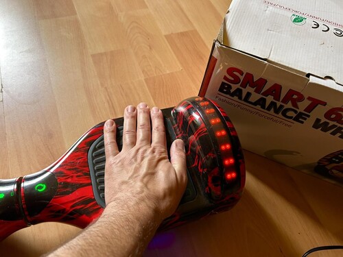 Beépített BLUETOOTH hangszóró Kerék átmérő: 6,5 col (17,8 cm) Méret (szél. /mag. /hossz. ): 59 x 17,5 x 19 cm Akár 20 km távolság egy töltéssel (teljesen feltöltött akkumulátor, sík terep és 80 kg-os felhasználó esetén) Max. sebesség: 10-15 km/h Irányítása könnyen elsajátítható A gép törzse középen el tud fordulni, így egyhelyben is megfordulhatsz vele A lábtartóba épített giroszkópok másodpercenként több mint százszor korrigálják a pozíciót, így a legkisebb mozdulatokra is reagál A készülék használatát 6 éves kortól ajánljuk Ajánlott súly: 25kg – 100kg Tűző napon, valamint tartós esőben és vízben használni tilos! Töltési idő kb. 2 óra Ha a gép 2 oldalát szimmetrikusan terheljük, akkor egyenesen előre (illetve hátra) indul el, ha különböző erővel terheljük, akkor pedig kanyarodni fog A gép törzse középen el tud fordulni, ez teszi lehetővé a hatékony kanyarodást vagy az egy helyben megfordulást Fel- és leszállás: keress egy helyet ahol sík a terep, meg tudsz állva kapaszkodni valamiben és senkit nem tudsz megütni az esetleg elguruló géppel Kapcsold be a gépet. Ekkor hangjelzés kíséretében felvillan a 2 led-lámpa (mindkét oldalon 2×4 LED világít) és zölden világít az akku visszajelző Kapaszkodj meg és helyezd az ügyesebbik lábadat teli talppal a gumi felület közepére – úgy próbáld helyezni a lábad, hogy a talpad közepére nehezedj (ne az elejére vagy a végére) A lábtartóba épített érzékelők hanggal is jelzik a kapcsolat létrejöttét. Ne ijedj meg, ha valamerre picit elindul amikor rálépsz, próbáld meg magad alatt tartani egy helyben a lábad egészen előre vagy hátra billentésével Tedd fel a másik lábadat is PONT abban a pozícióban, amiben a másik lábad van (az aszimmetrikusan elhelyezett lábak megnehezítik az irányítást) A fellépés legyen határozott és lehetőleg gyors mozdulat Ne engedd el a kapaszkodót, hanem szállj le hátrafelé (magad mögé). MINDIG hátrafelé kell leszállni! Többször ismételd meg a fel- és leszállást kapaszkodás közben Ha úgy érzed, hogy már biztonságosan fel- és le tudsz szállni a gépről, akkor lépj fel és találd meg az egyensúlyod A legelső dolog a haladás megkezdése előtt, hogy el tudd engedni a kapaszkodódat és egy helyben meg tudj állni A helyes testtartás a kihúzott, de laza tartás. Ne görnyedj, ne a földet nézd! Húzd ki magad és figyelj a talp-izmokra, melyeket a járásnál is használsz Ha úgy érzed, uralod a járgányt (bár teljesen mozdulatlanul nem tudsz még megmaradni), akkor engedd el a kapaszkodót és próbálj meg jobbra, helyben megfordulni Nézz ki magad előtt egy pontot és picit előre dőlve indulj el az irányába (ne a földet nézd, hanem a célodat) Ne a fejedet döntsd előre, hanem az egész tested súlypontját helyezd előre Célod előtt hozd magad függőlegesbe és állj meg Fordulj meg egy helyben vagy dőlj hátra és indulj el lassan tolatva. Szállj le hátrafelé! Kapcsold ki a gépet. A kikapcsolást hangjelzés kíséri Kikapcsolt állapotban a gépre lépni TILOS! Minél vastagabb egy cipő talpa, annál nehezebb irányítani. Használjátok vékony talpú cipőben!