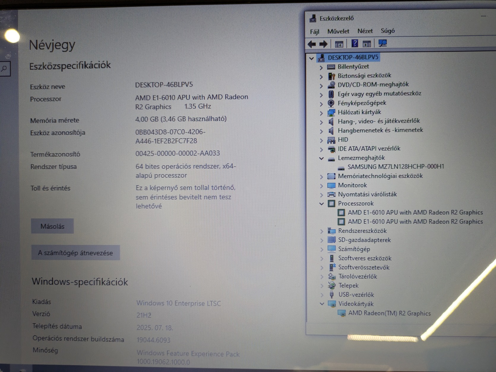AMD E1-6010 cpu, 4gb ram, Radeon R2 vga, 128gb ssd.