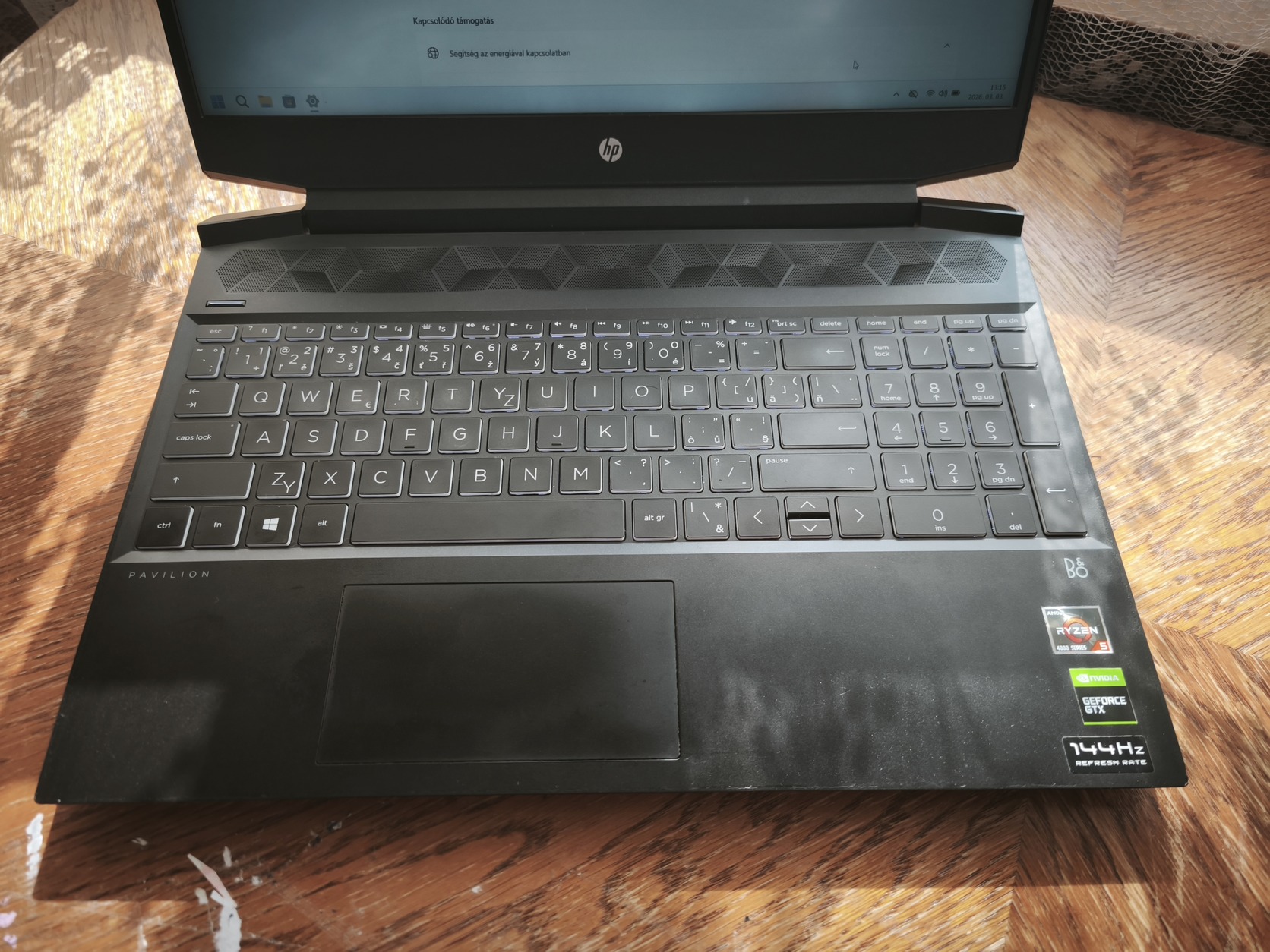 LCD: 15,6" FHD 144Hz (egy pici halvány white spot van bal oldalon a windows tálca felett, alig észrevehető, kijelző ezen kívül karc és pixelhiba mentes)